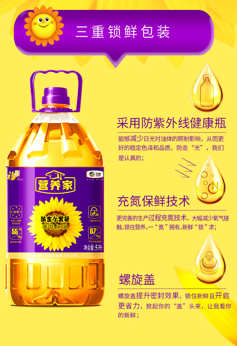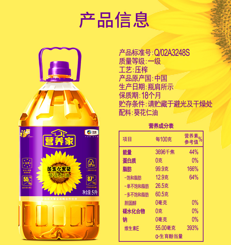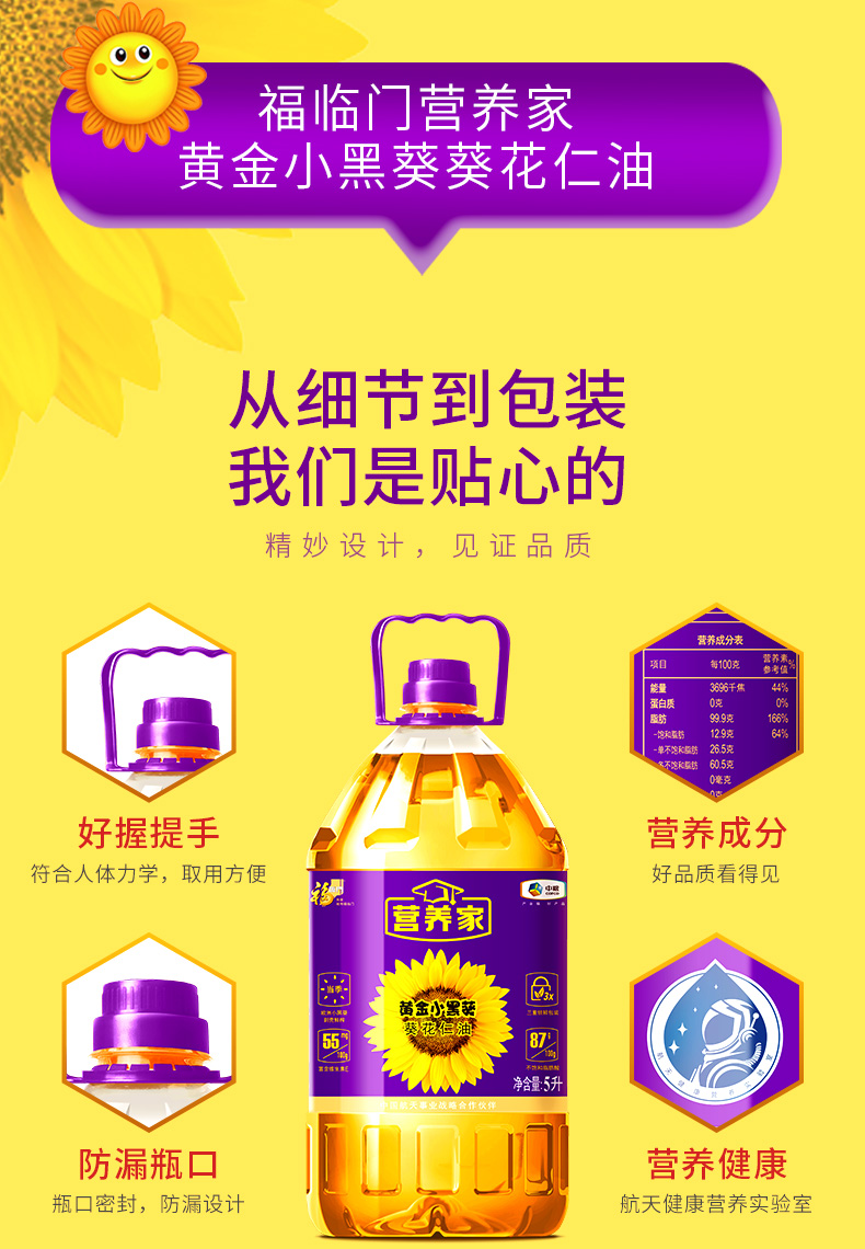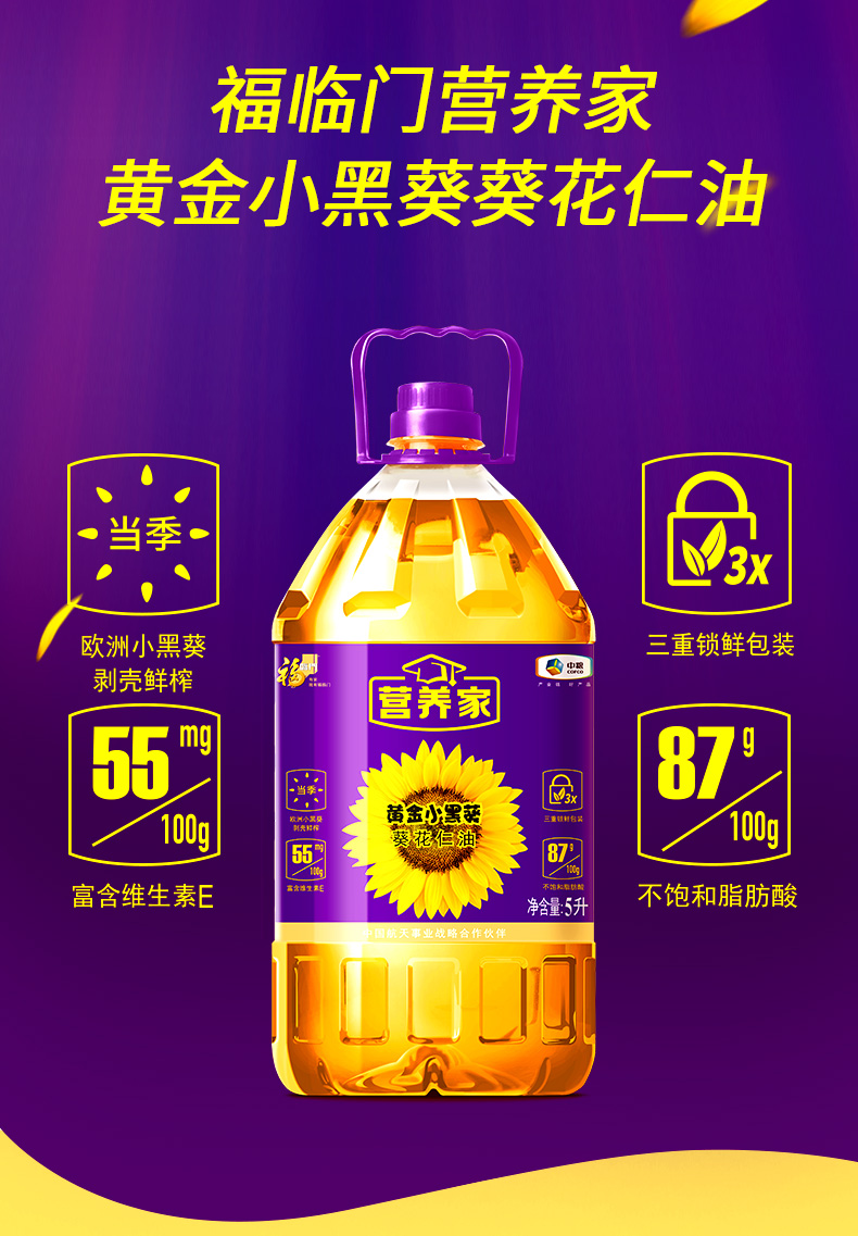 商品名称:【京东/德邦配送】中粮福临门营养家黄金小黑葵葵花仁油5L