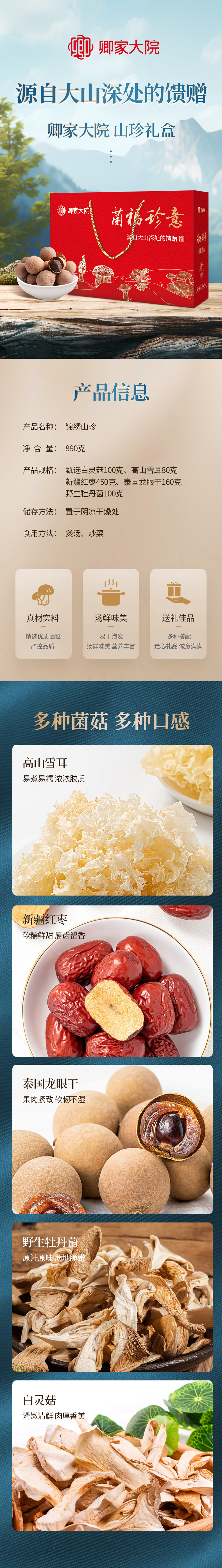商品名称:卿家大院菌福珍意锦绣山珍干货礼盒890g