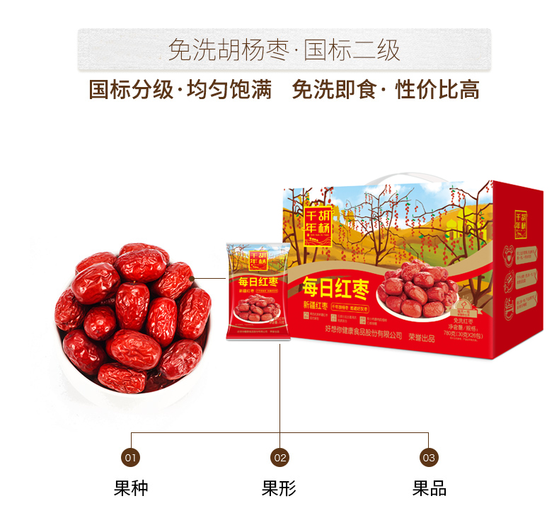 商品名称:好想你千胡年杨新疆每日免洗红枣整箱780g