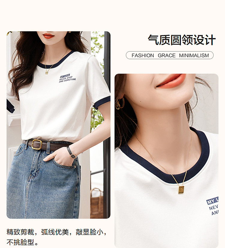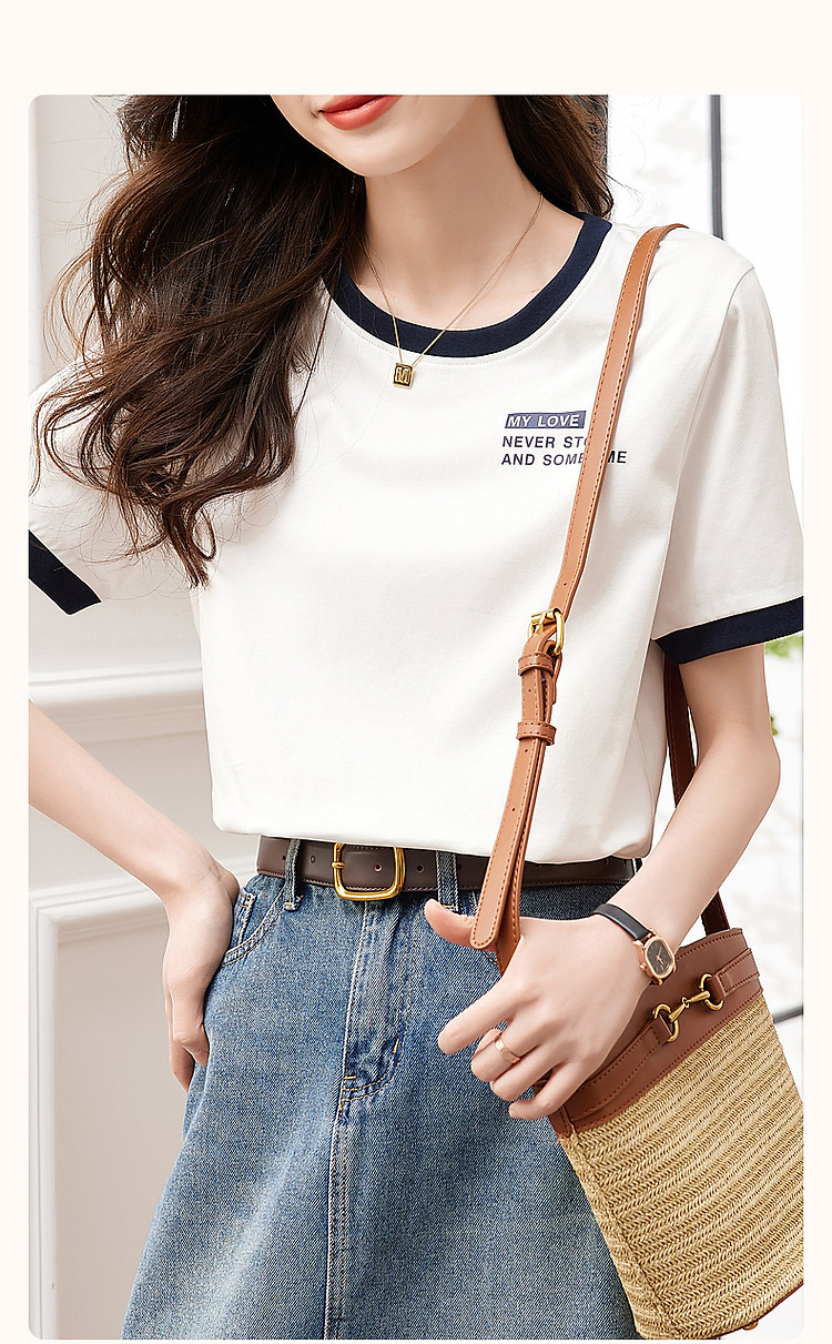 【简约棉氨针织女式t恤】夏圆领字母撞色短袖t恤女 213825