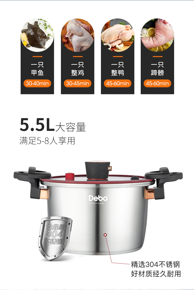 商品名称:Debo/德铂5.5升沃尔姆斯微压锅DEP-DS271