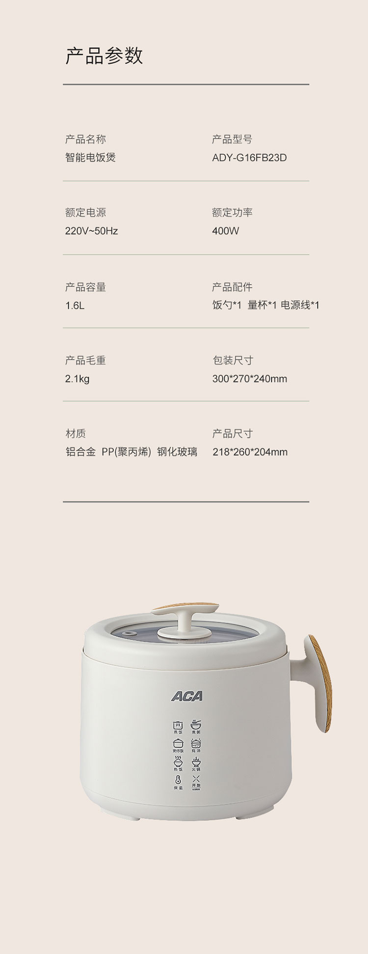 商品名称:ACA/北美电器1.6升智能电饭煲ADY-G16FB23D