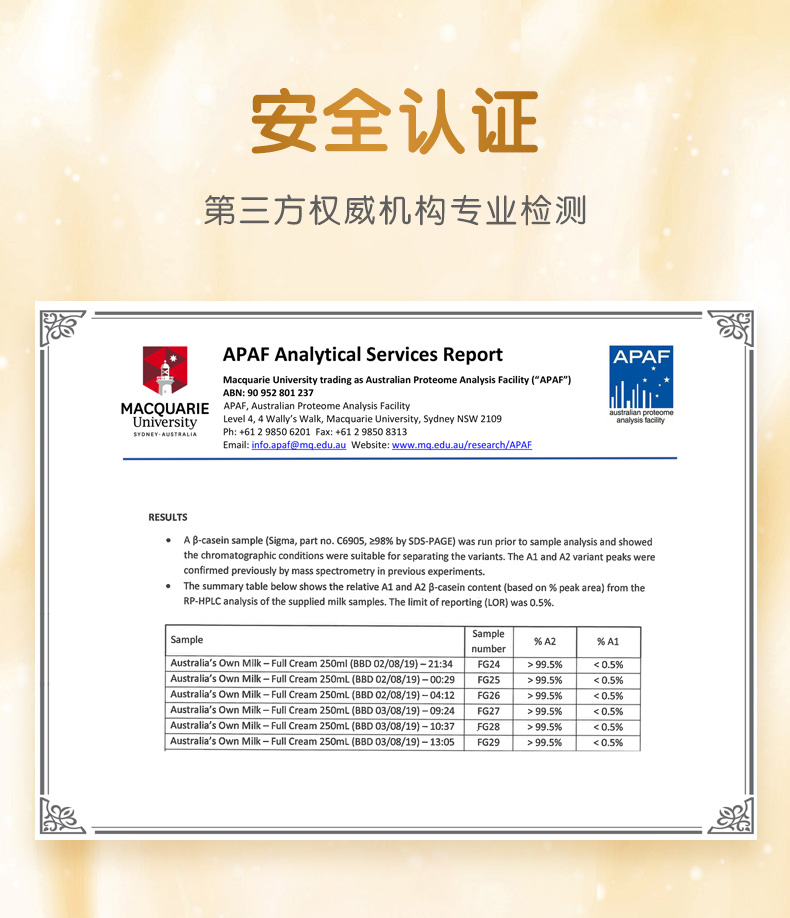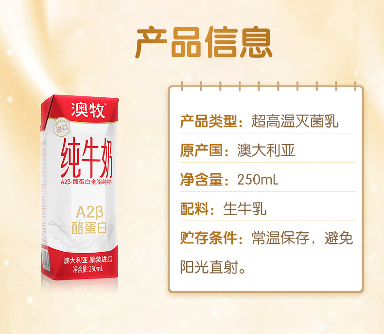 商品名称:Australia's Own/澳牧A2β-酪蛋白纯牛奶整箱250ml*10盒