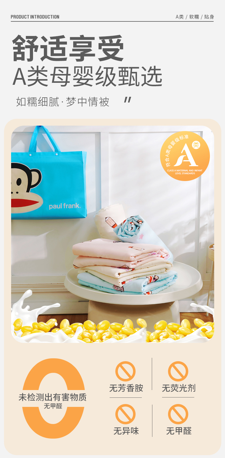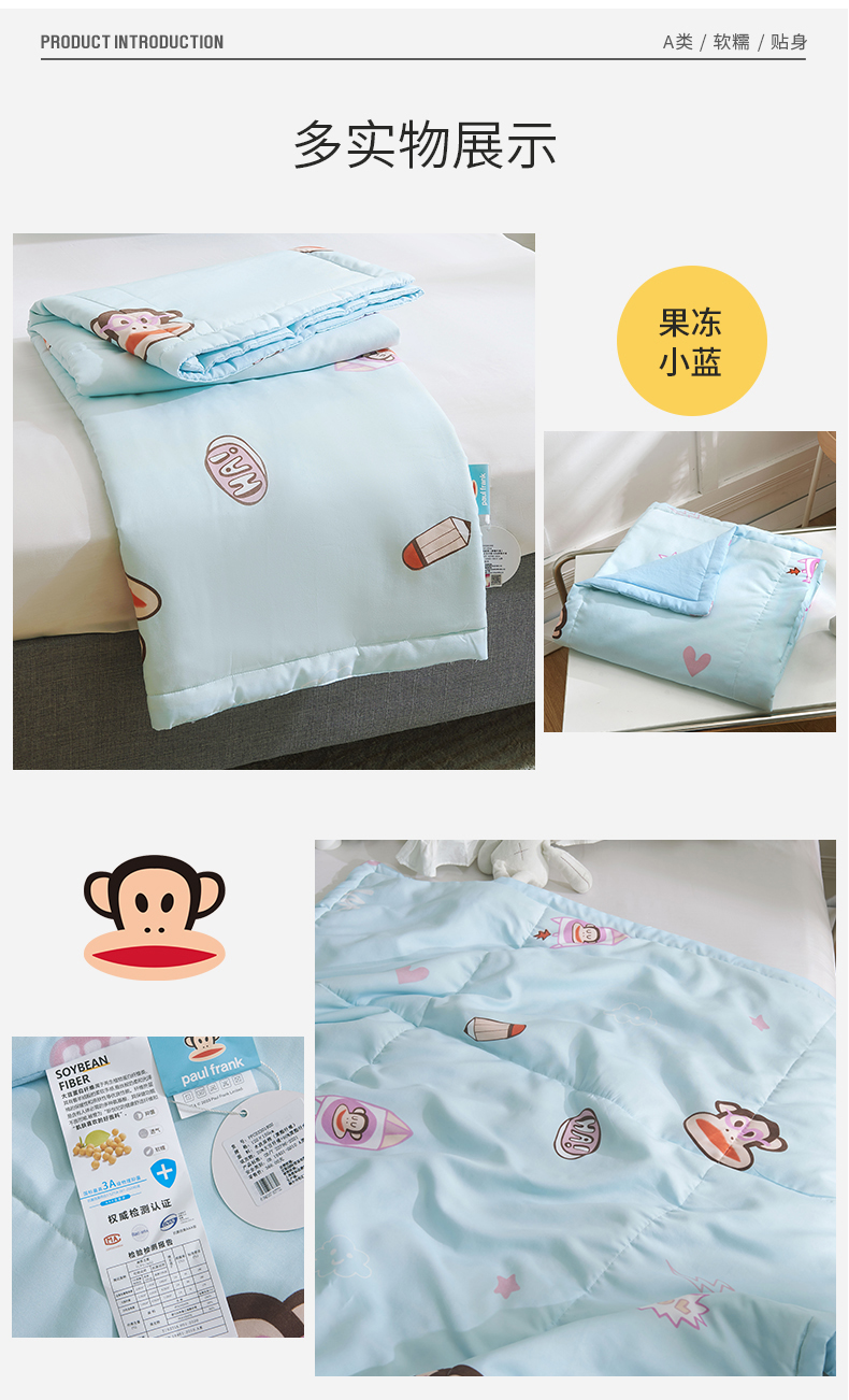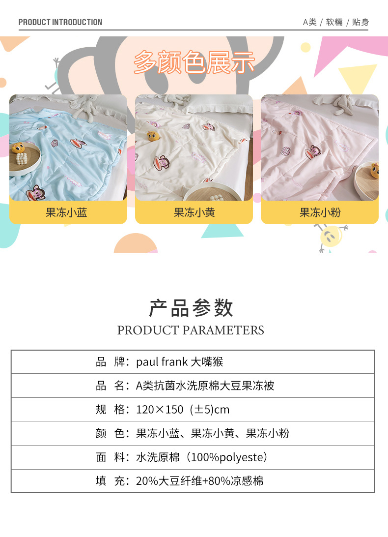 商品名称:paul frank/大嘴猴A类抗菌水洗原棉大豆果冻被120*150cm