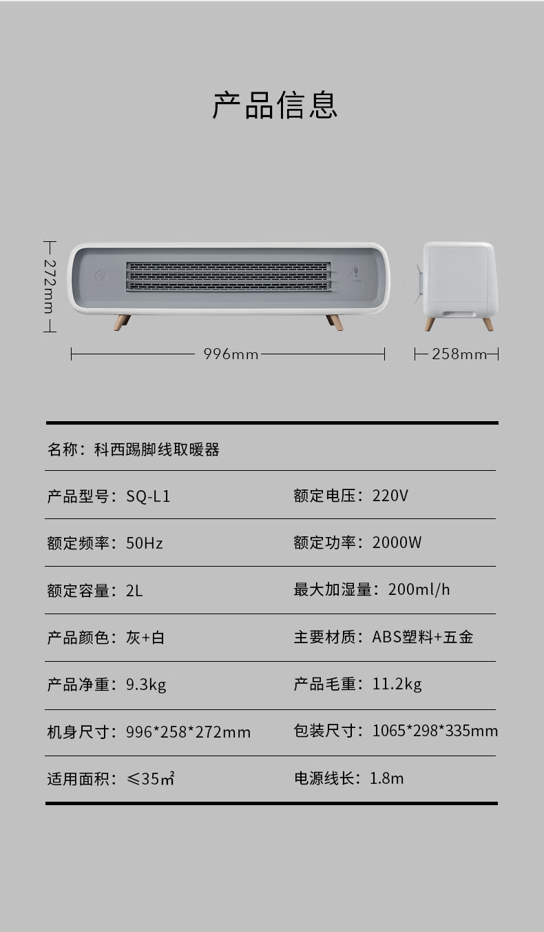商品名称:【顺丰配送】KEHEAL/科西踢脚线取暖器-灰+白SQ-L1