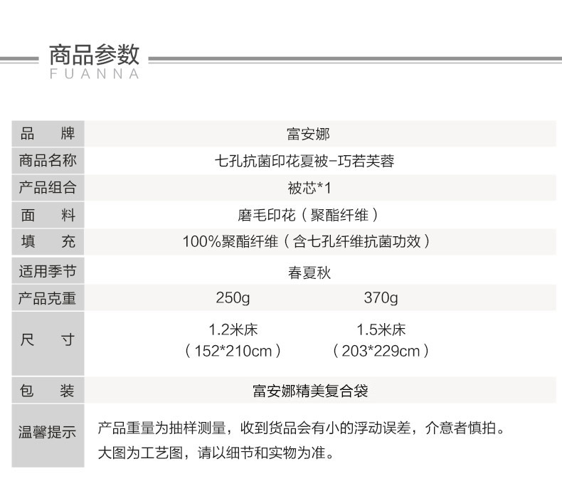 商品名称:【京东/顺丰配送】FUANNA/富安娜巧若芙蓉七孔抗菌印花夏被