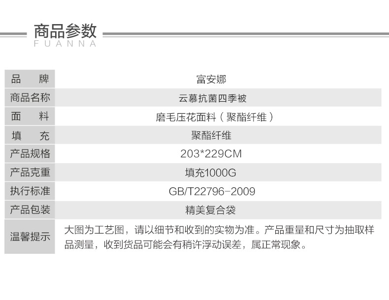 商品名称:【京东/顺丰配送】FUANNA/富安娜云慕抗菌四季被203*229cm 1000g