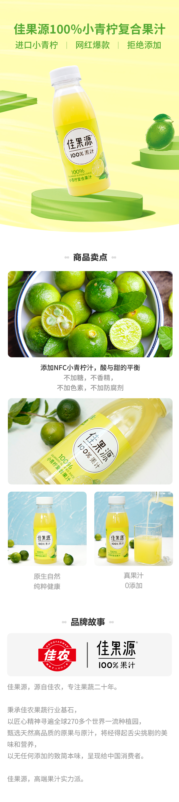 商品名称:佳果源100%小青柠复合果汁整箱280g*9瓶