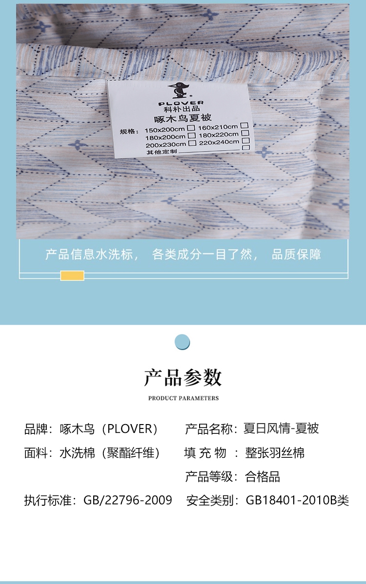 商品名称:PLOVER/啄木鸟科朴优品夏日风情水洗棉夏被150*200cm 750g
