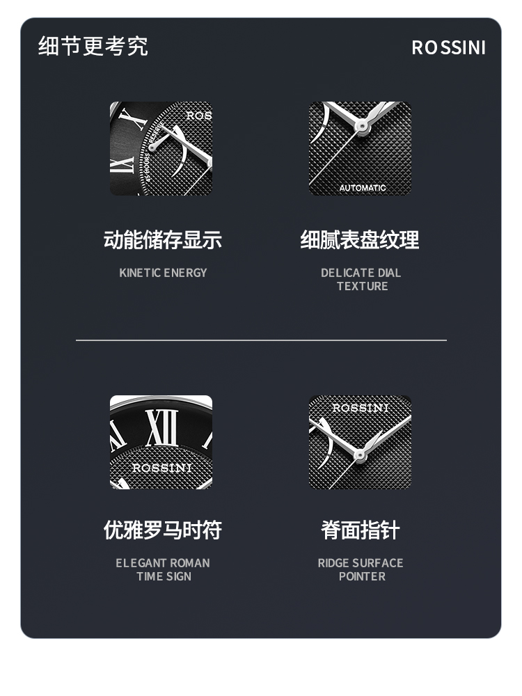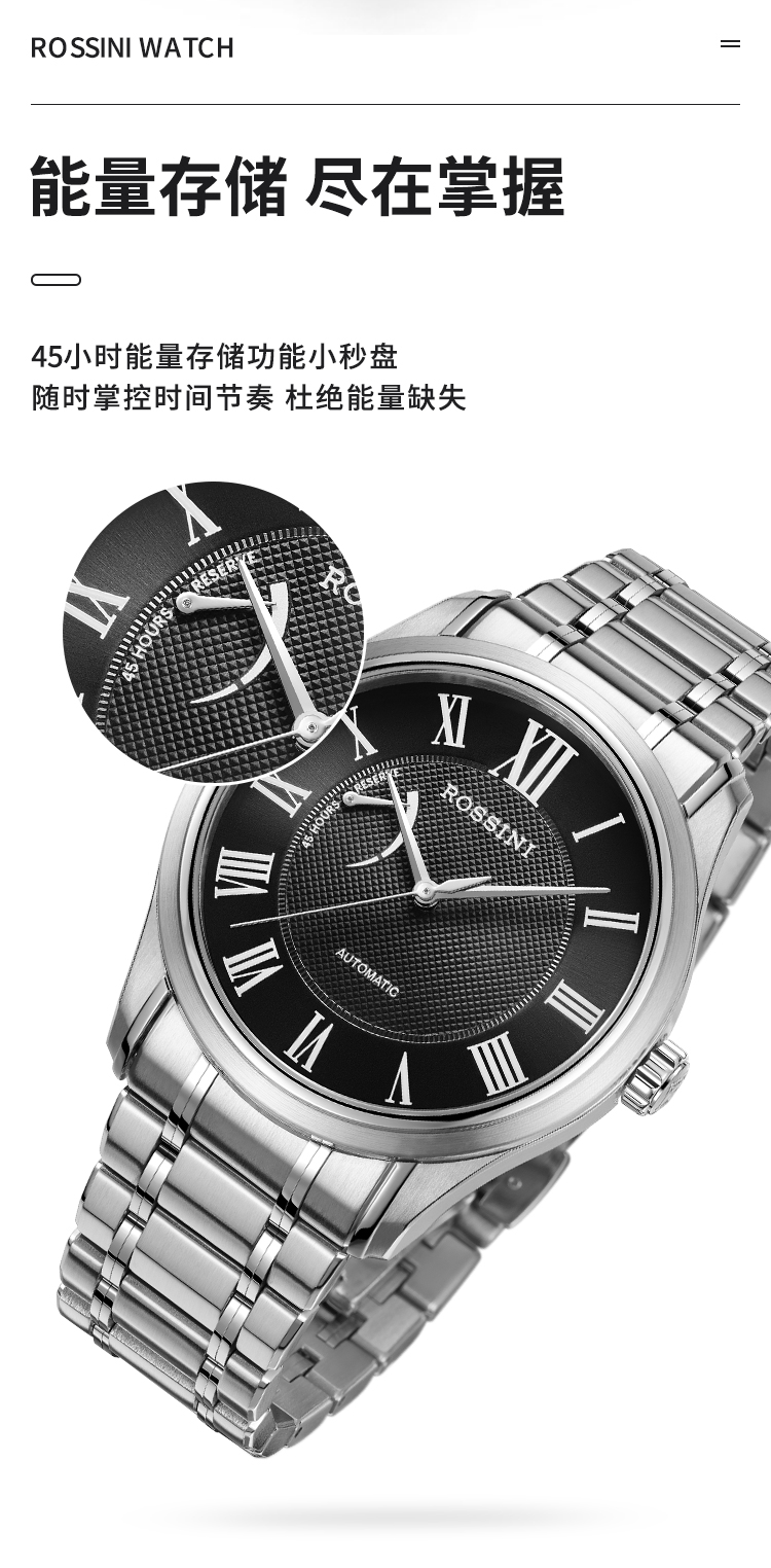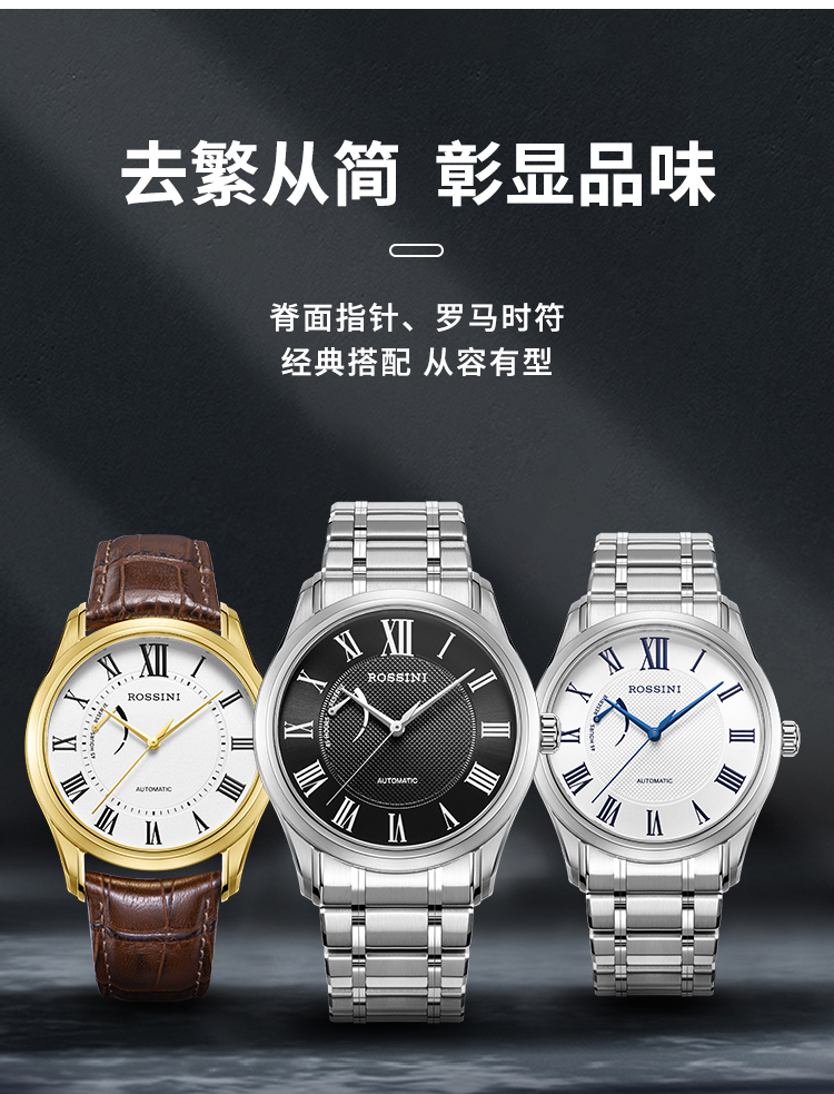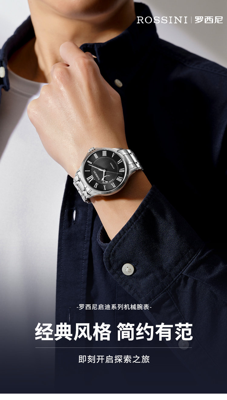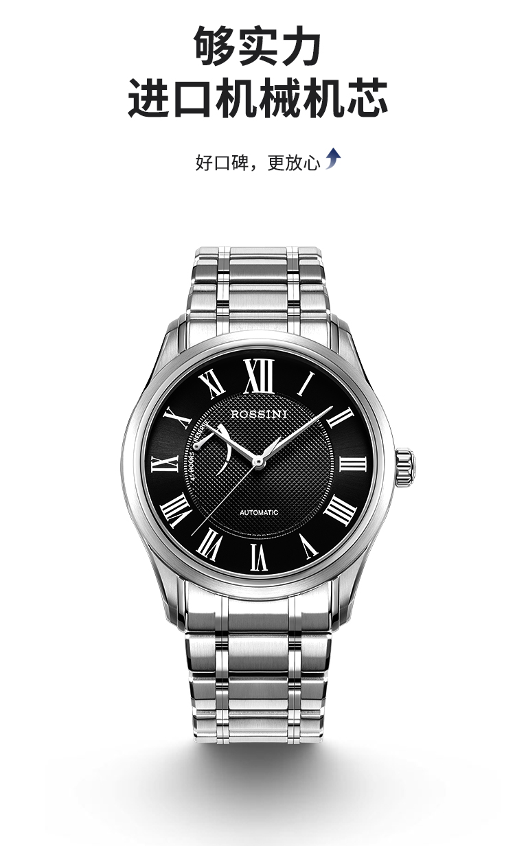 商品名称:Rossini罗西尼 启迪系列 机械手表商务黑盘钢带男表SJ5615W04B
