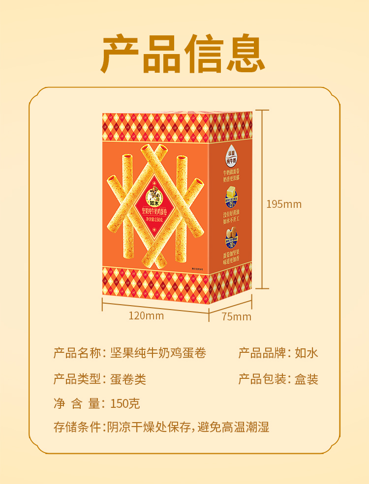 商品名称:如水坚果纯牛奶鸡蛋卷150g*2盒