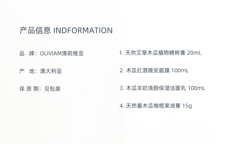 商品名称:Oliviam/澳莉维亚木瓜系列护肤四件套礼盒装(国际版)