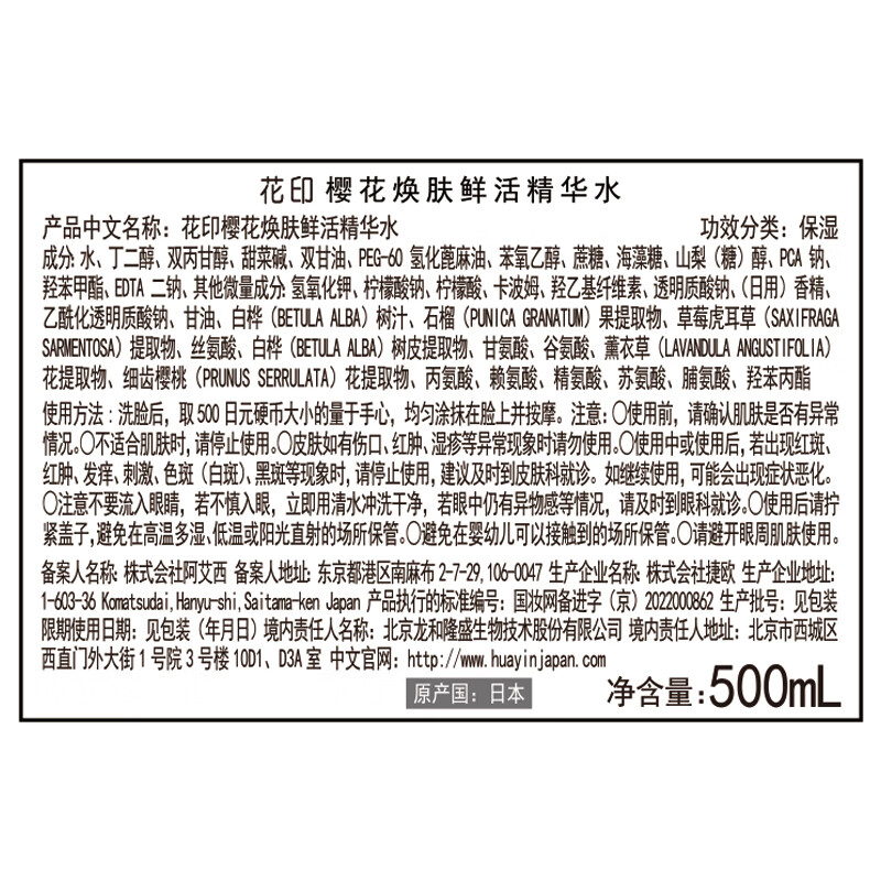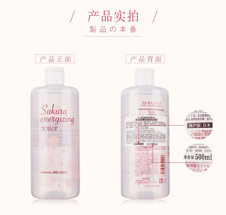 商品名称:HANAJIRUSHI/花印樱花焕肤鲜活精华水500ml(日版)