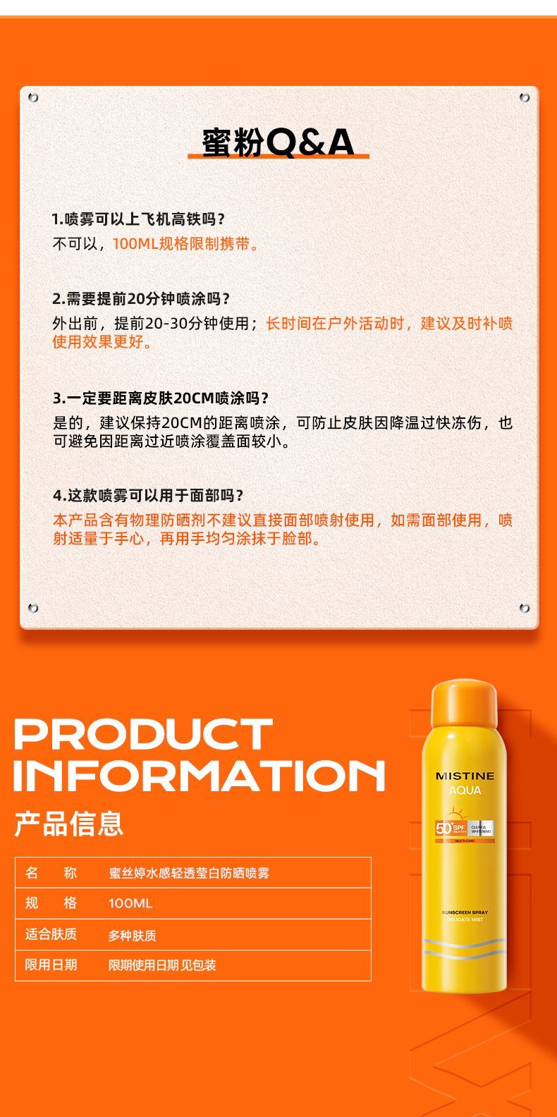 商品名称:Mistine/蜜丝婷 小黄喷水感轻透莹白防晒喷雾100ml SPF50+ PA++++