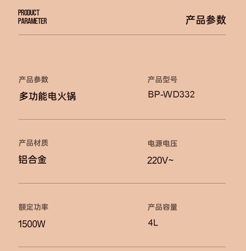 商品名称:BAOPAI/豹牌4升多功能电火锅BP-WD332