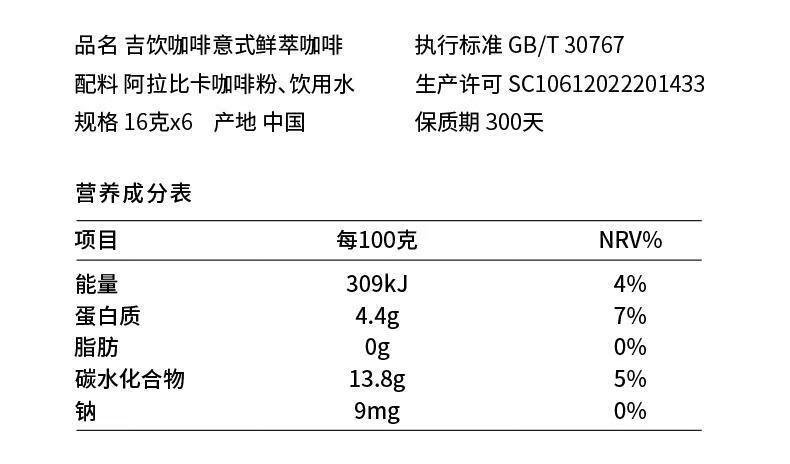 商品名称:吉饮意式鲜萃咖啡液96g*2盒