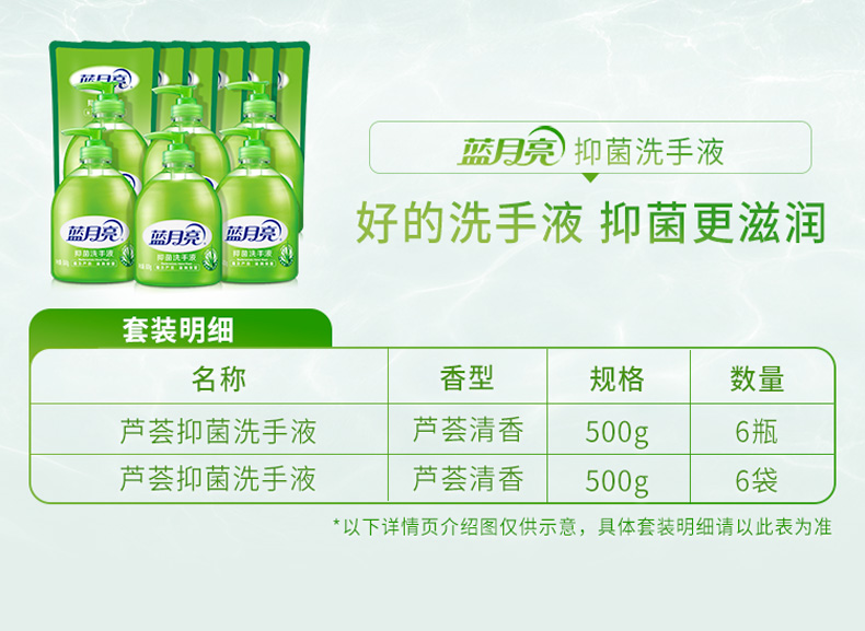 商品名称:蓝月亮芦荟洗手液瓶500g*6瓶+蓝月亮芦荟洗手液袋500g×6袋 80000804