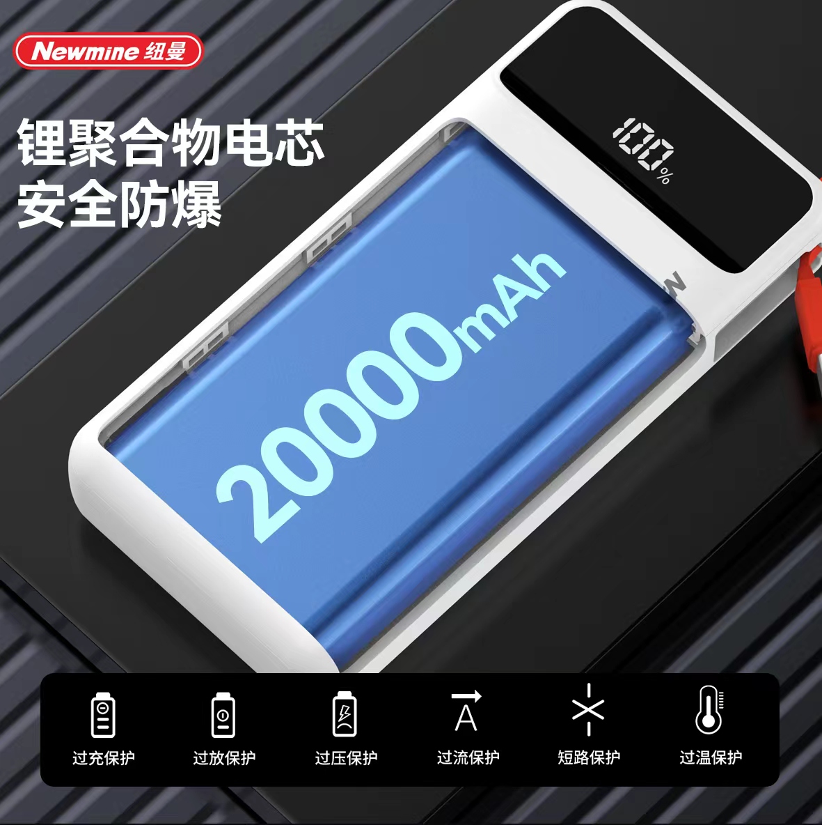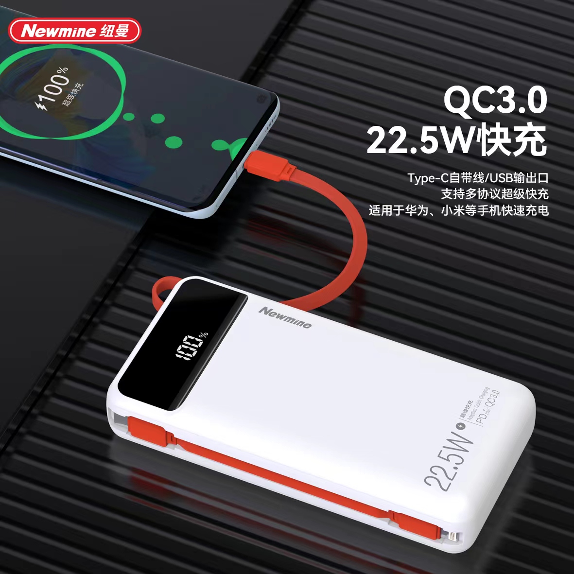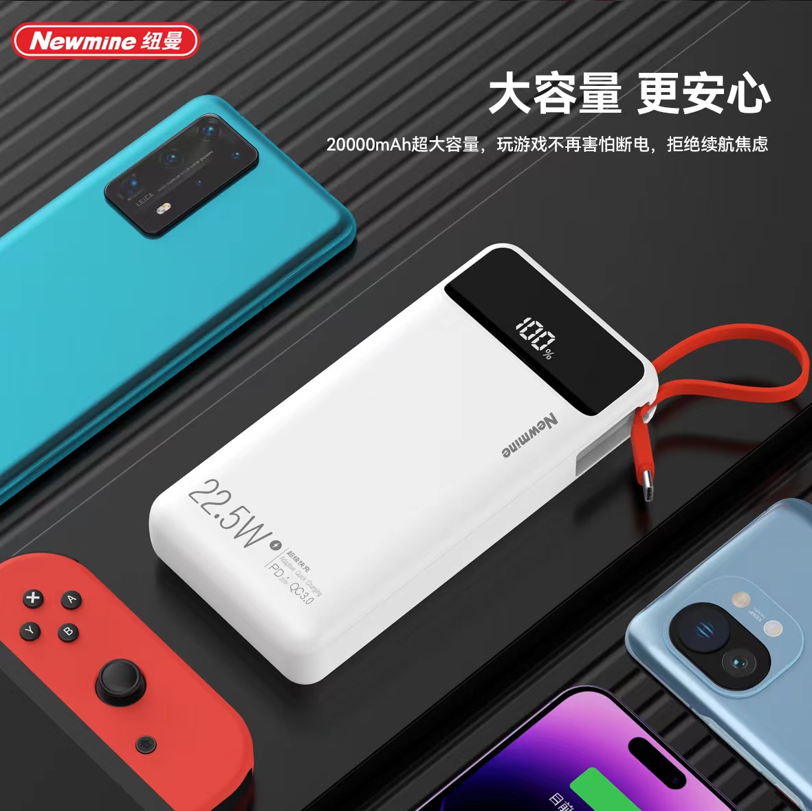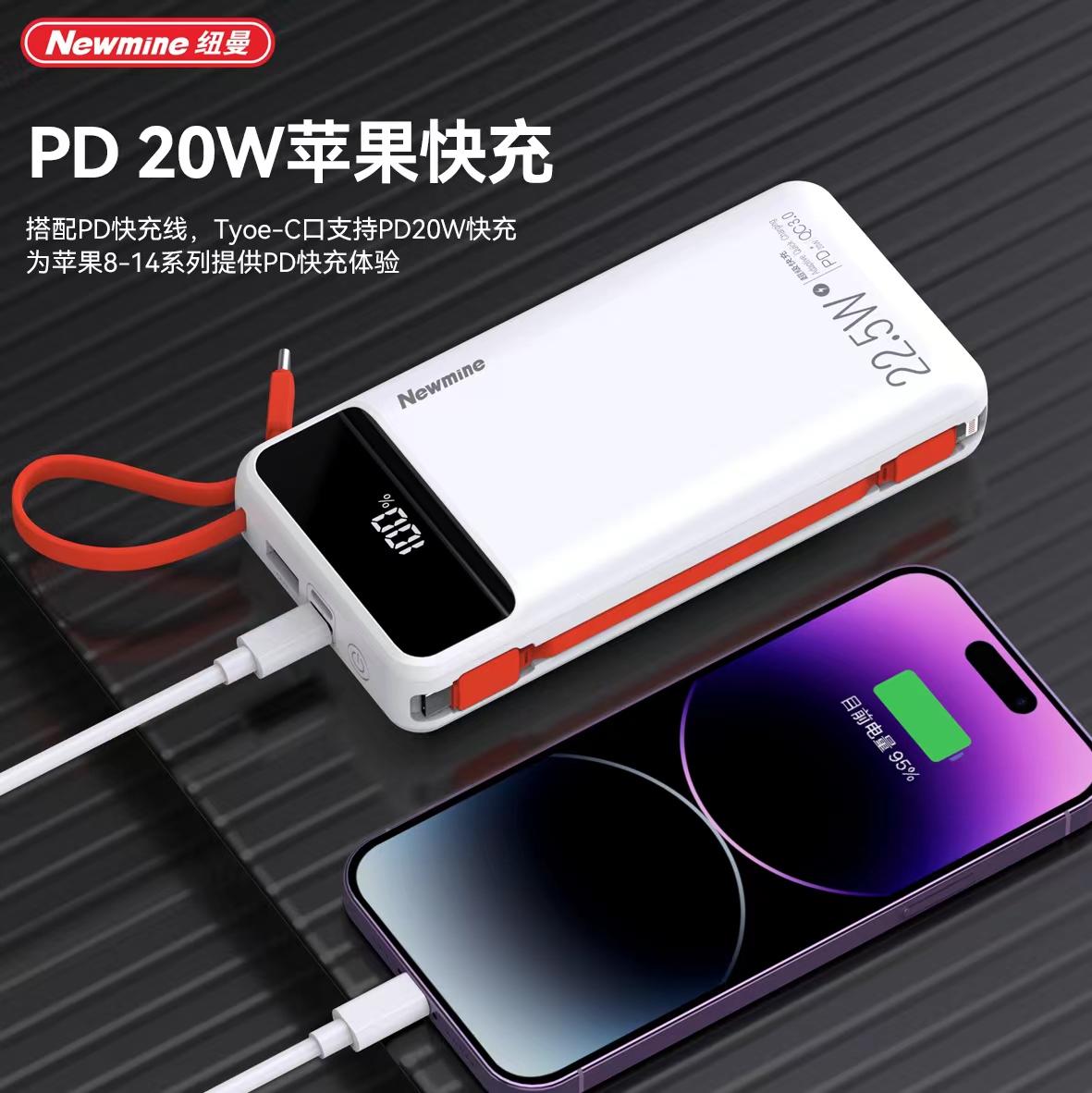 商品名称:【顺丰配送】Newmine/纽曼20000mAh自带线超级快充电源P270