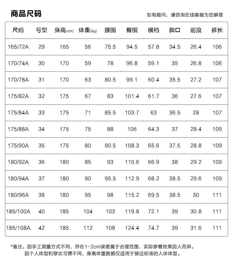 | 尺码 | 裤脚围(cm) | 腰围(cm) | 裤长(cm) | 前浪(cm) | 臀围(cm) | 号型 |