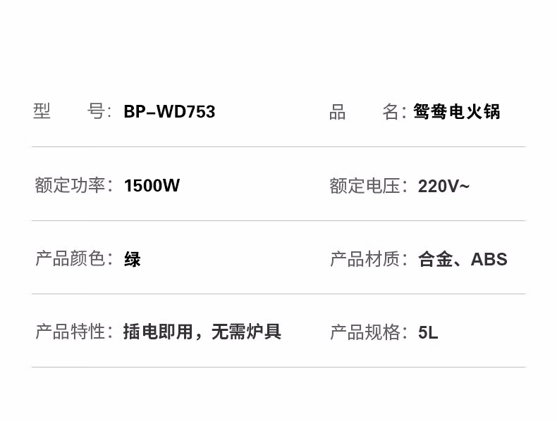 商品名称:BAOPAI/豹牌5升鸳鸯电火锅BP-WD753