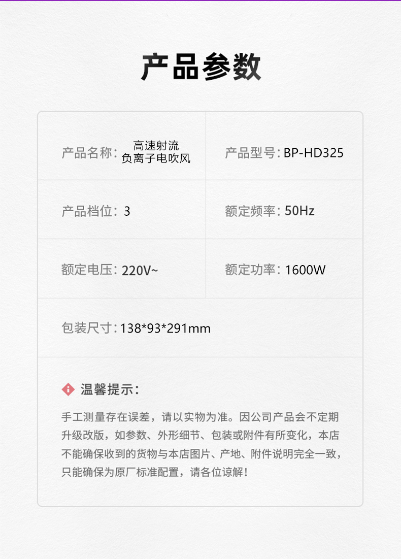 商品名称:【京东/顺丰配送】BAOPAI/豹牌高速射流负离子电吹风BP-HD325