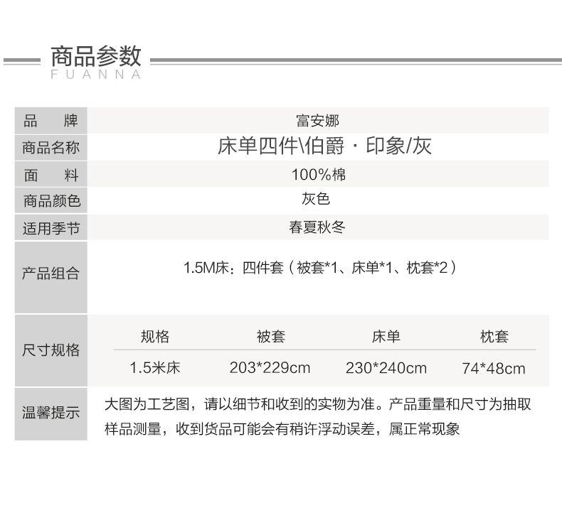商品名称:FUANNA/富安娜提花伯爵印象四件套203*229cm