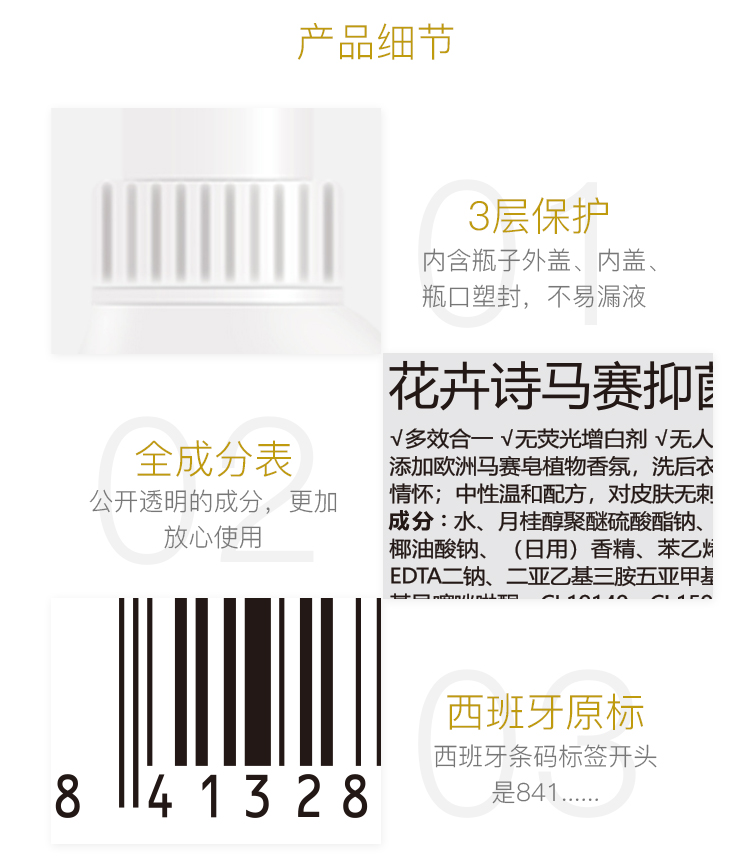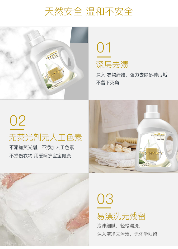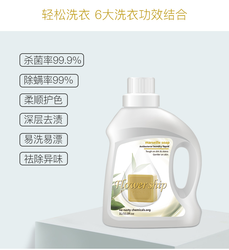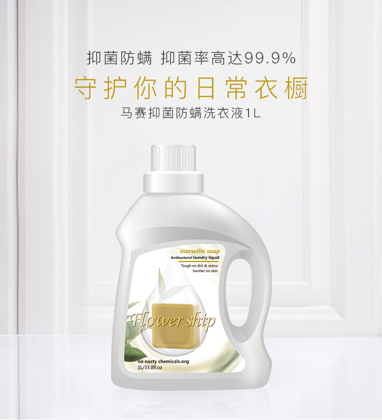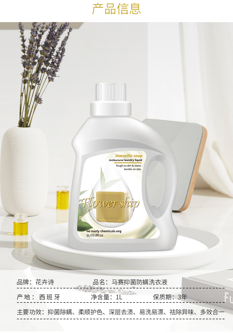 商品名称:Flower ship/花卉诗马赛抑菌防螨洗衣液1L*3桶