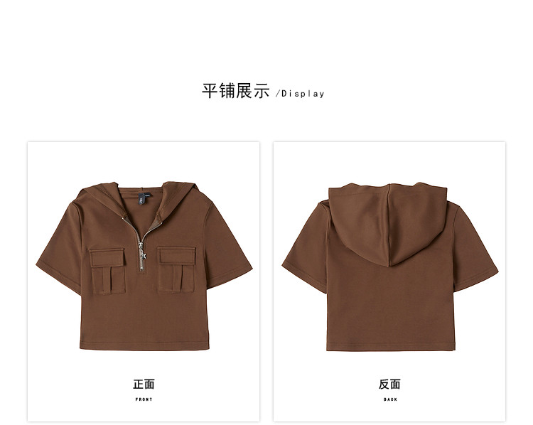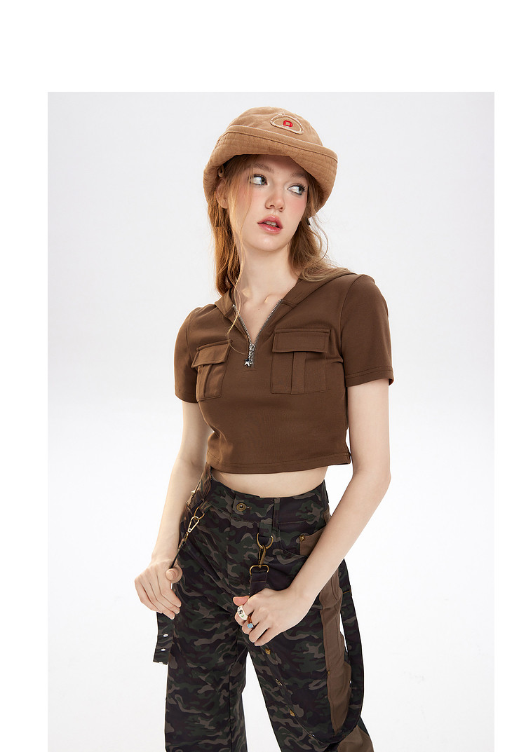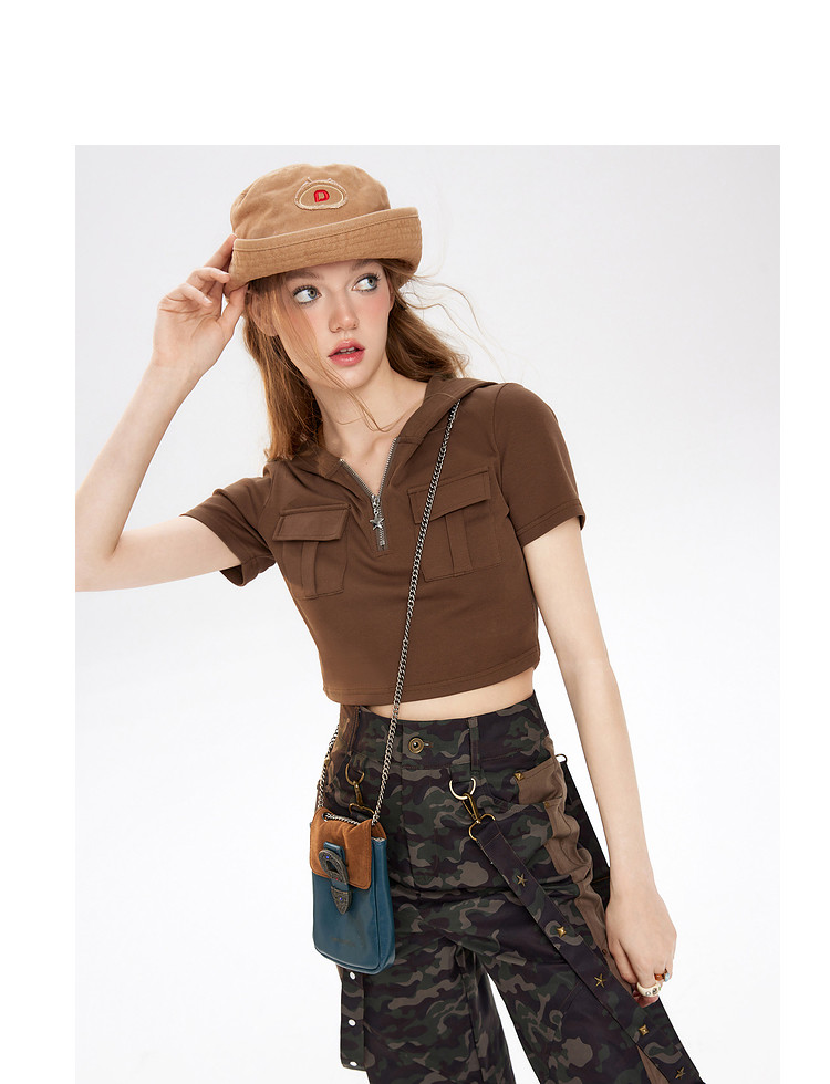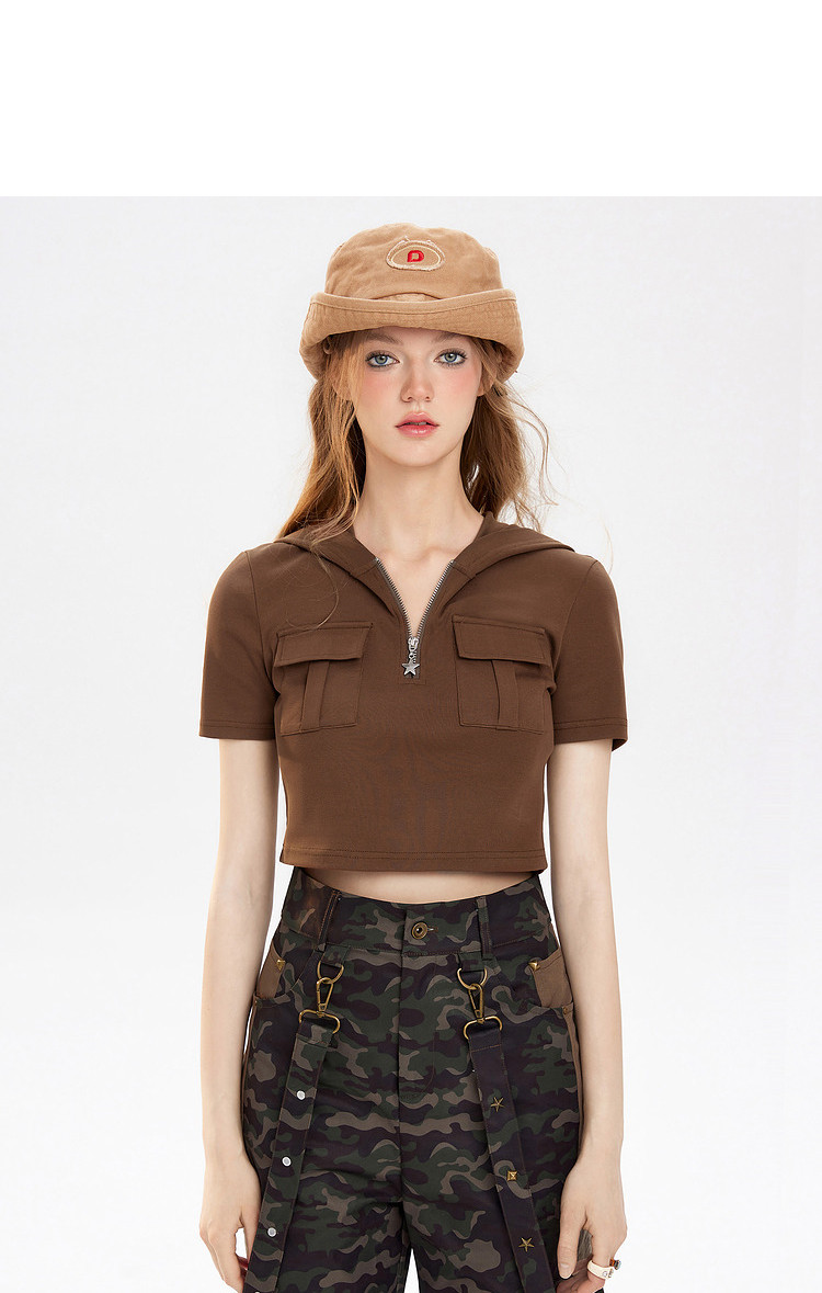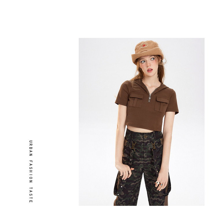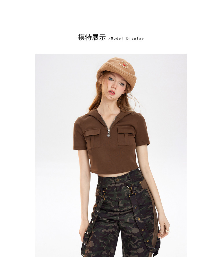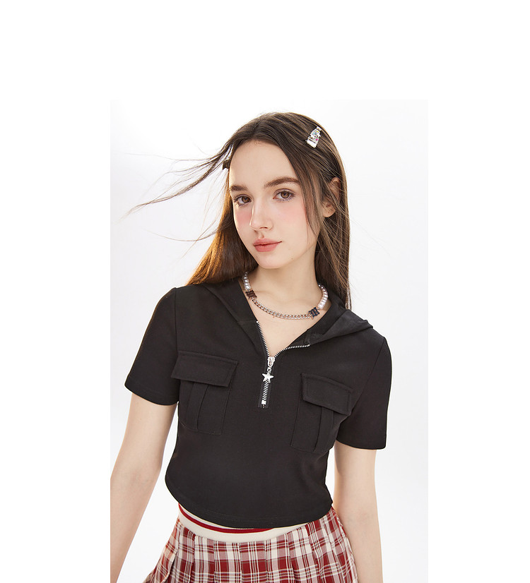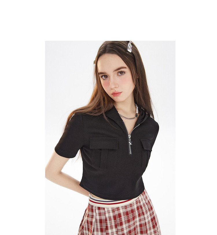 商品名称:夏装奶系炸街短袖t恤女修身拉链连帽辣妹上衣 748244