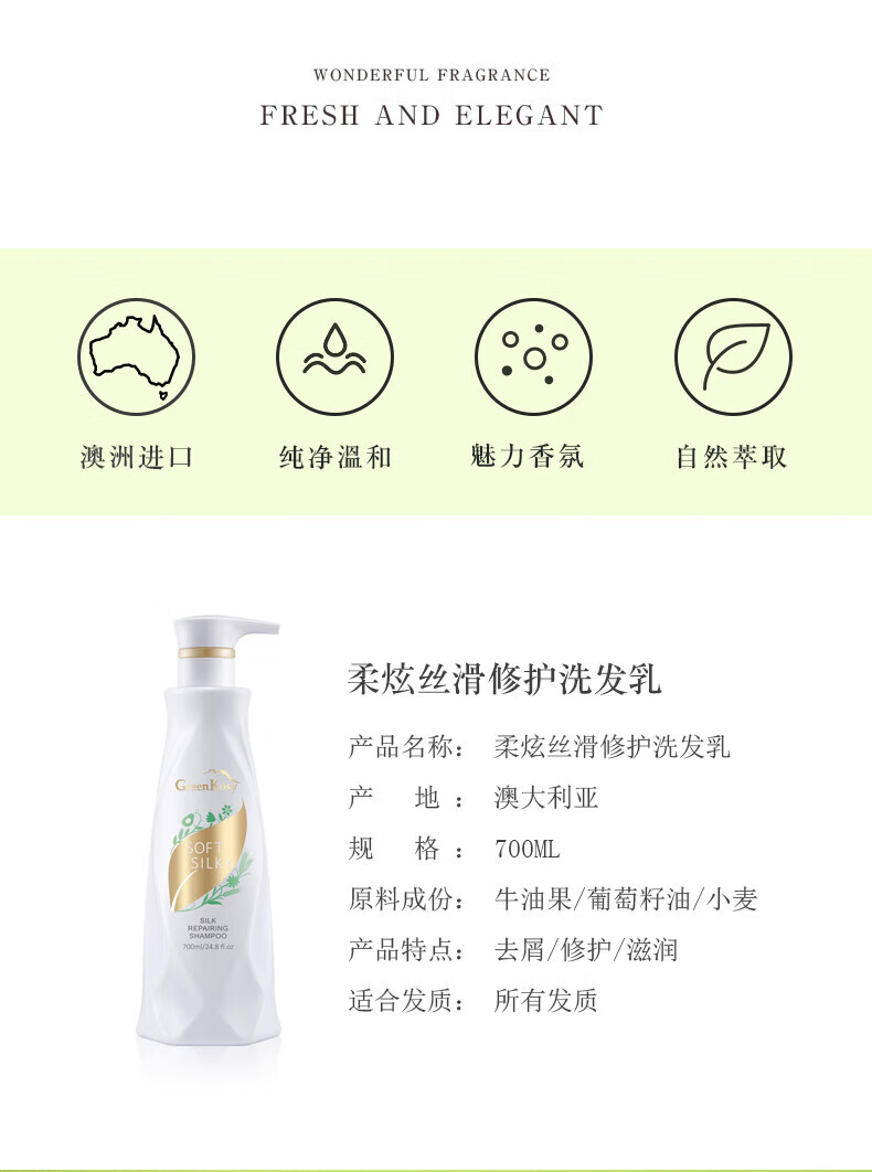 商品名称:GreenKosy/绿色溪谷柔炫丝滑修护洗发乳700ml