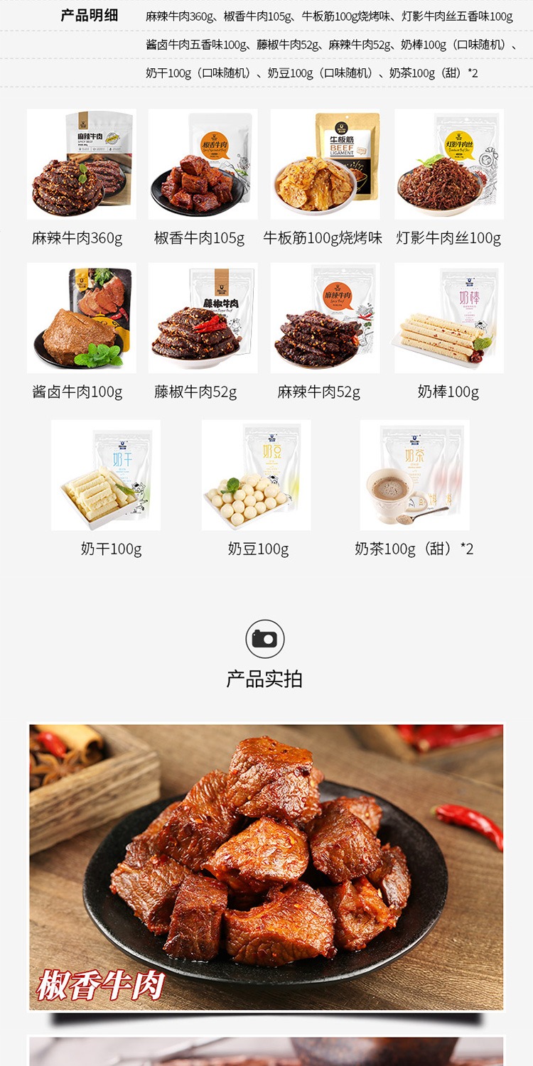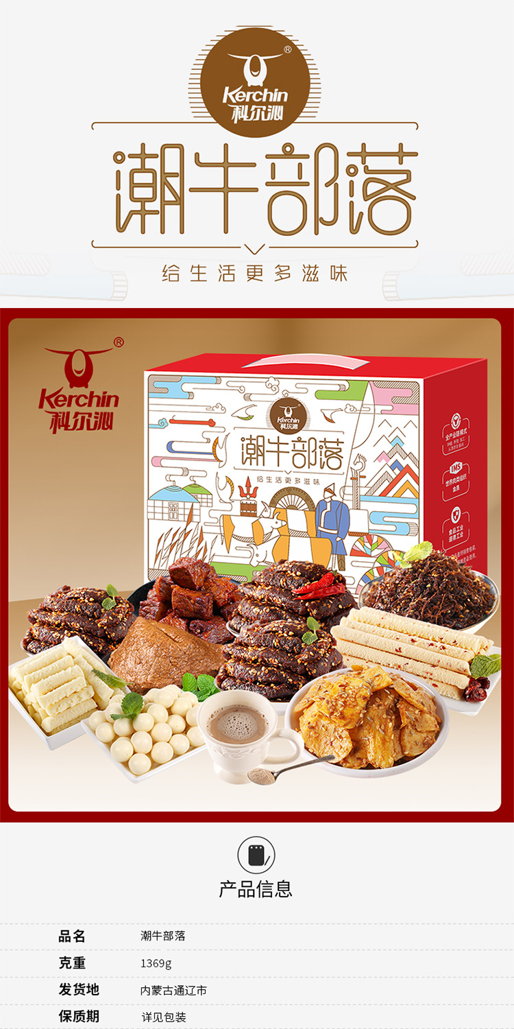 商品名称:Kerchin/科尔沁潮牛部落牛肉干奶干零食礼盒1369g