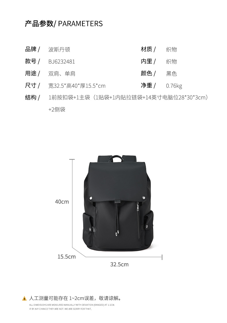 商品名称:BOSTANTEN/波斯丹顿双肩包-黑色BJ6232481