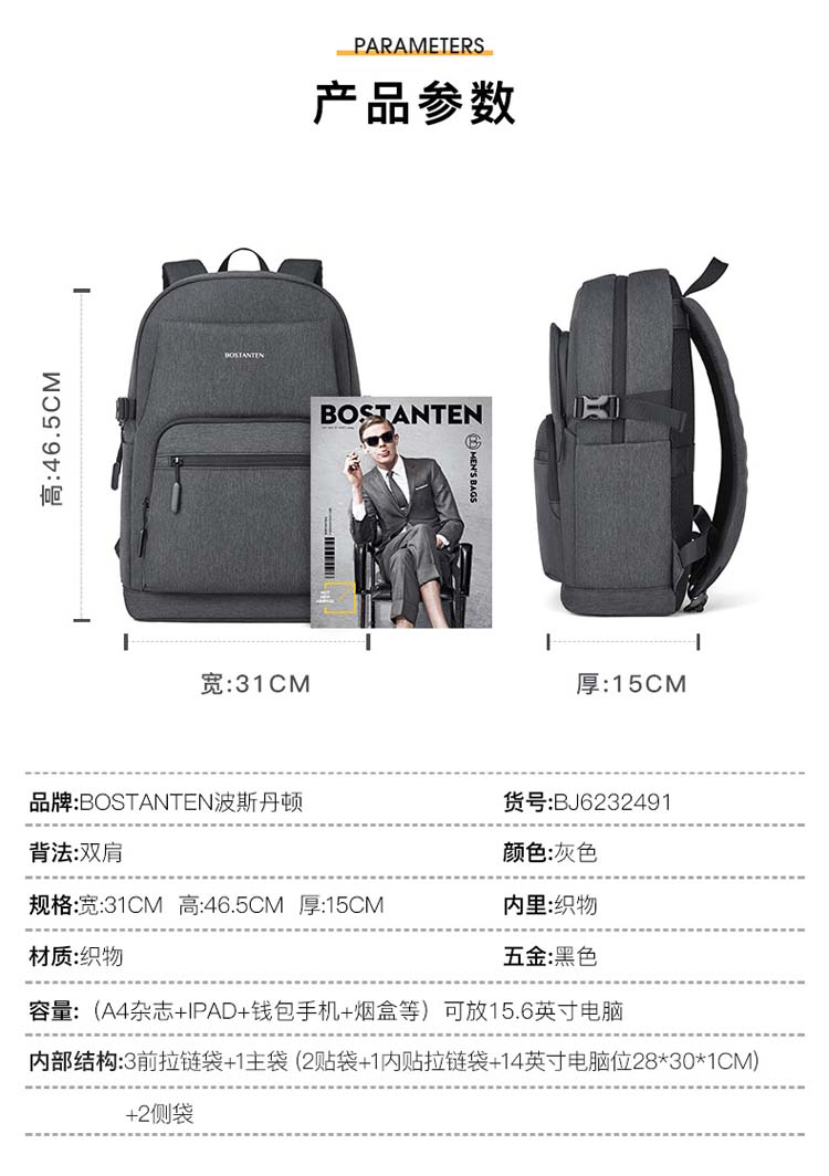商品名称:BOSTANTEN/波斯丹顿双肩包-灰色BJ6232491