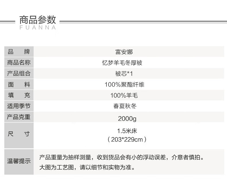 商品名称:FUANNA/富安娜忆梦抗菌羊毛冬被203*229cm 2000g