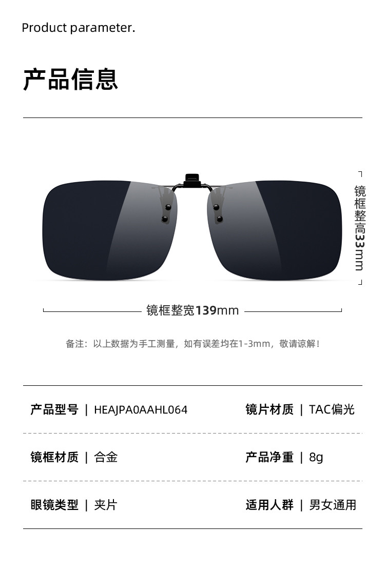 商品名称:【超轻便捷】近视专用偏光太阳镜夹片眼镜男士开车驾驶墨镜女挂片 007812