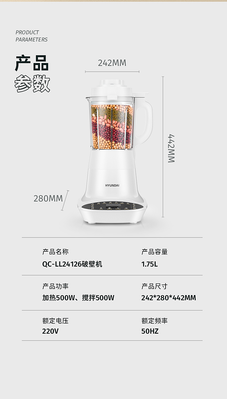 商品名称:HYUNDAI/现代1.75升破壁机QC-LL24126