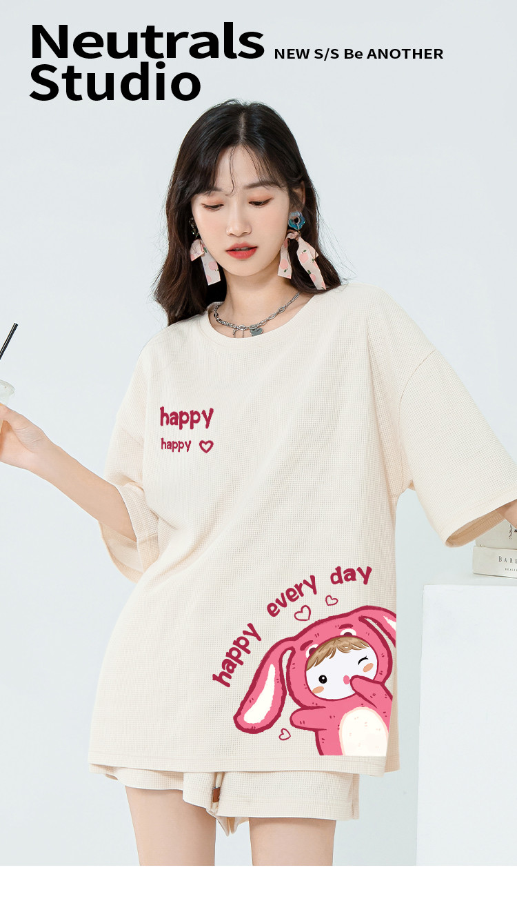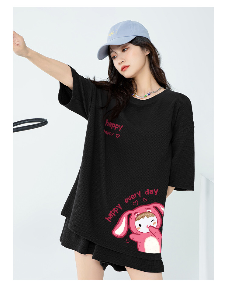 【女装】华夫格运动套装女夏季宽松重磅中长T+三分短裤 987219