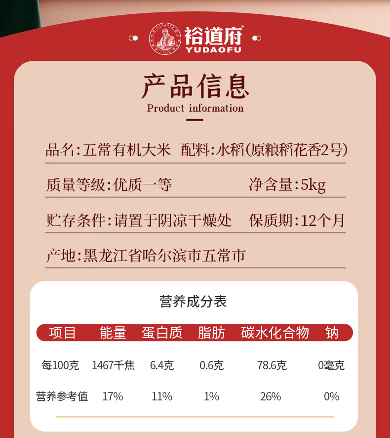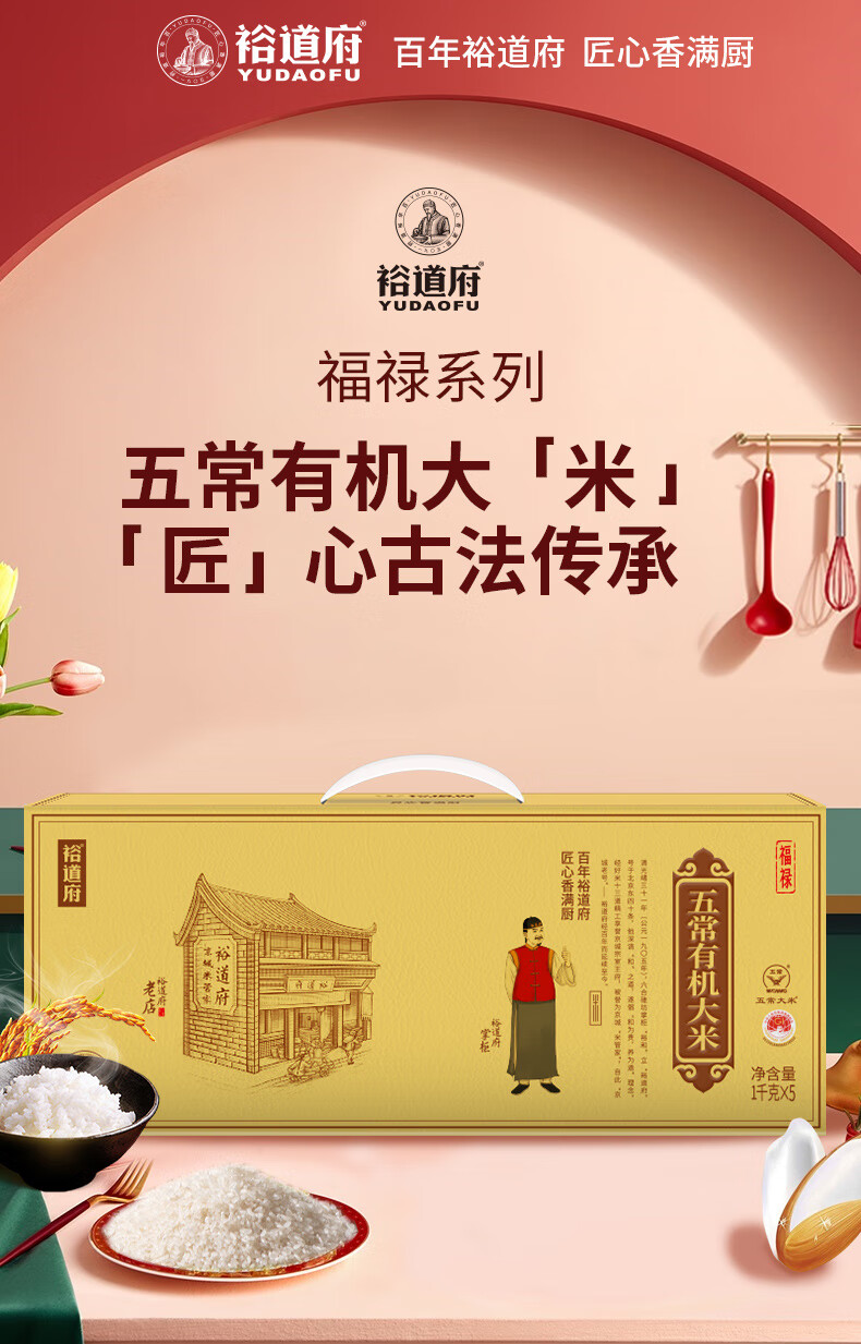 商品名称:【京东/德邦配送】裕道府福禄五常有机大米金色礼盒5kg