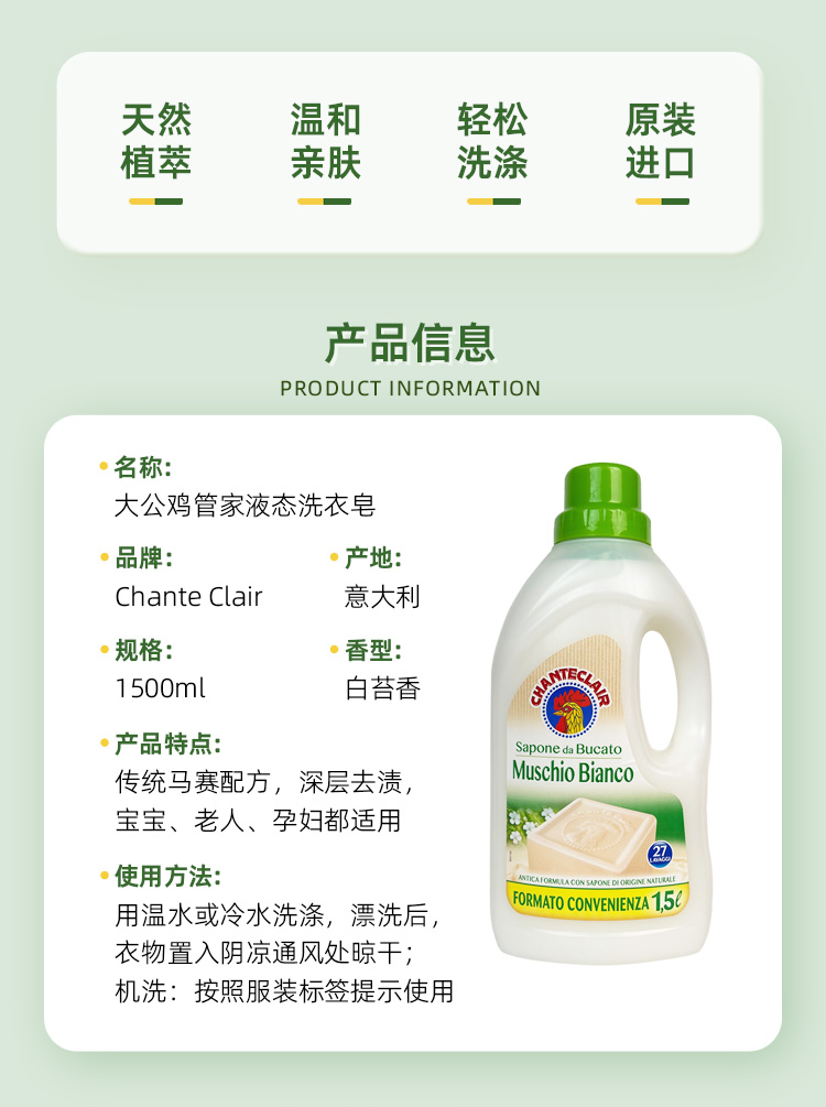 商品名称:CHANTECLAIR/大公鸡管家白苔香液态洗衣皂1500ml