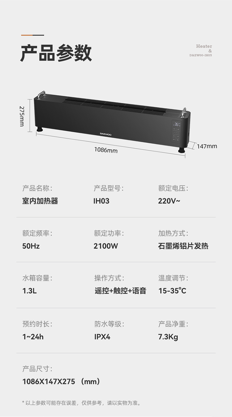 商品名称:【顺丰配送】DAEWOO/大宇踢脚线火焰取暖器IH03