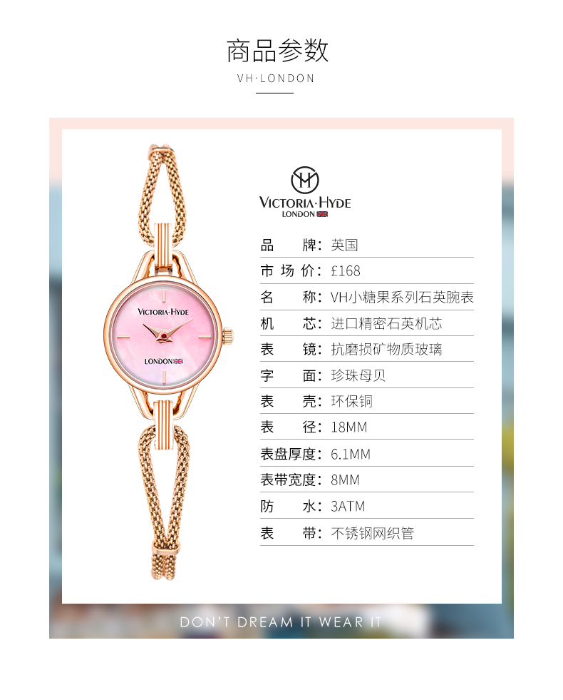 商品名称:Victoria.Hyde/维多利亚海德 小糖果系列石英腕表 个性防水圆型手表18mm(送手链)