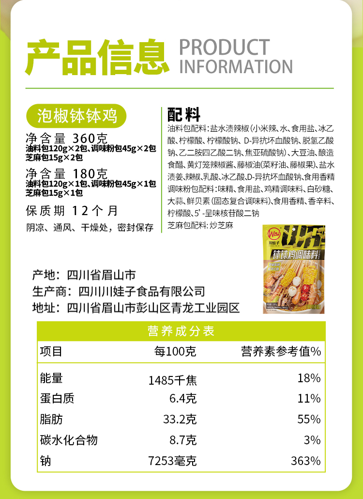 商品名称:川娃子泡椒钵钵鸡调味料