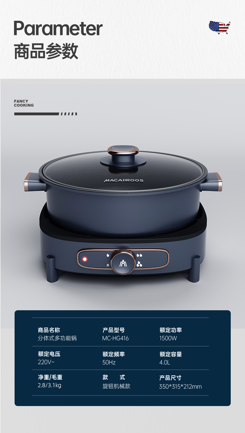 商品名称:MACAIIROOS/迈卡罗4升分体式多功能锅MC-HG416