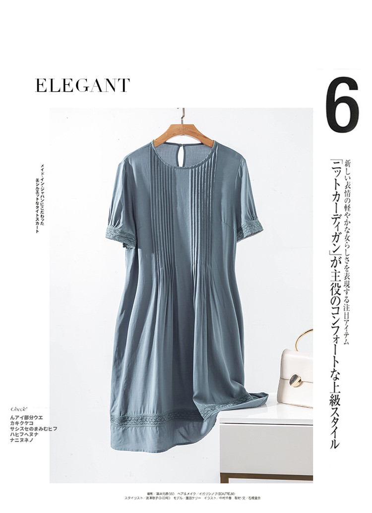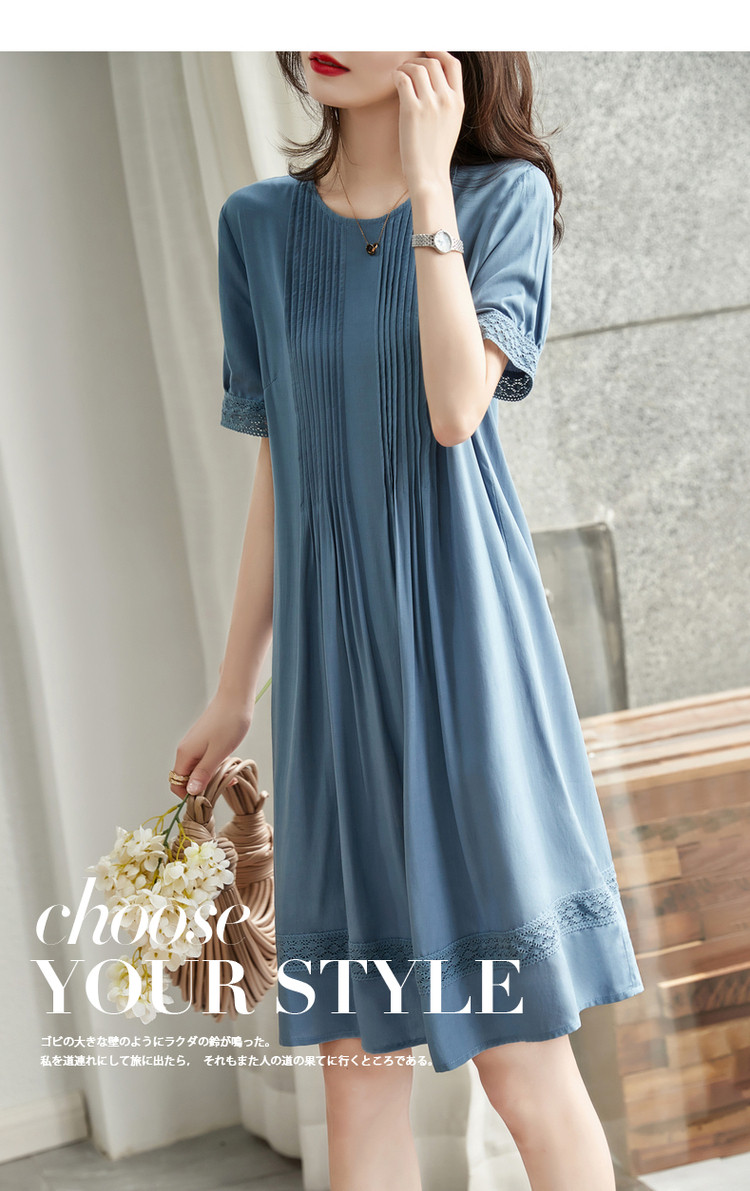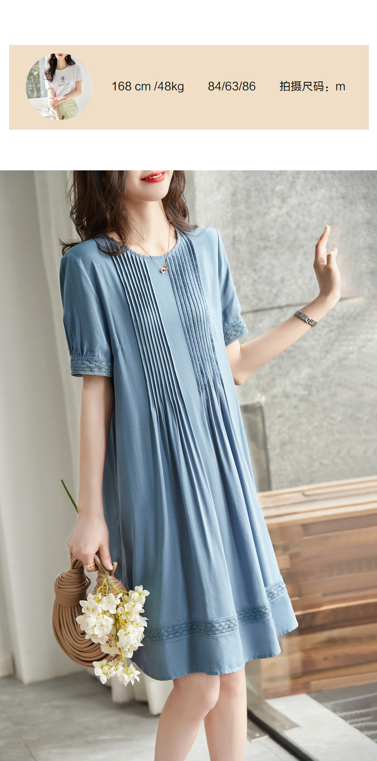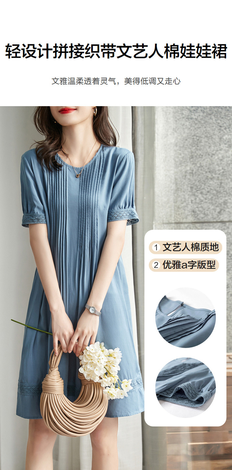 商品名称:【文艺人棉娃娃裙】夏圆领短袖a字拼接织带连衣裙女中长款 776001