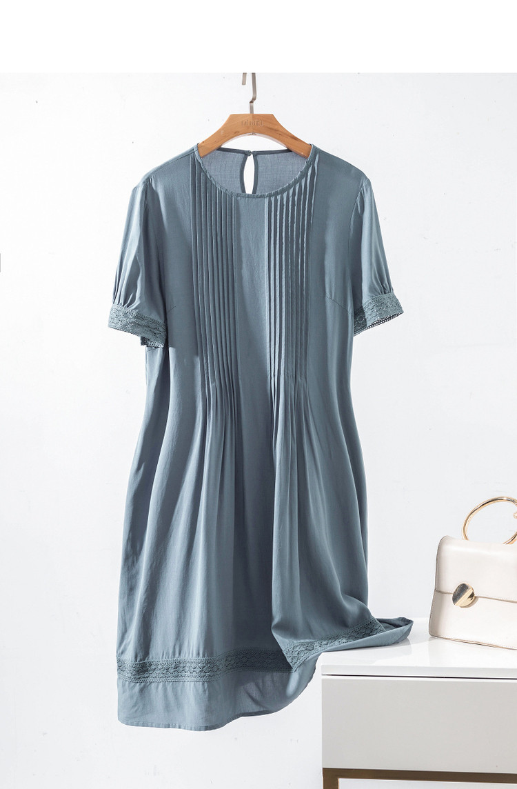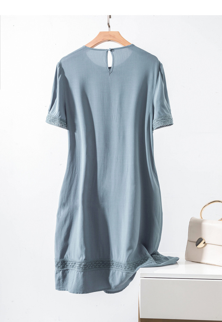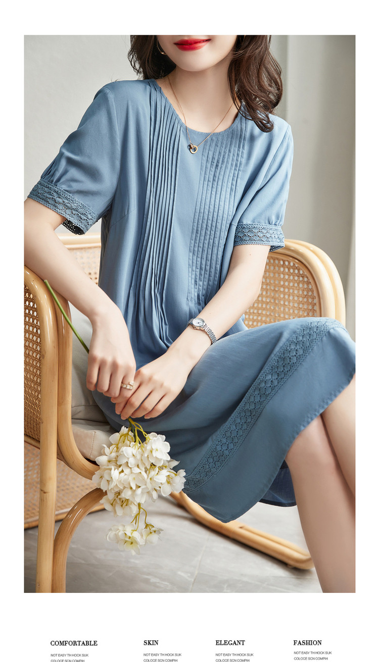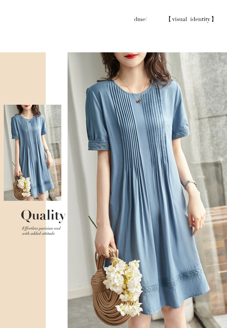 商品名称:【文艺人棉娃娃裙】夏圆领短袖a字拼接织带连衣裙女中长款 776001