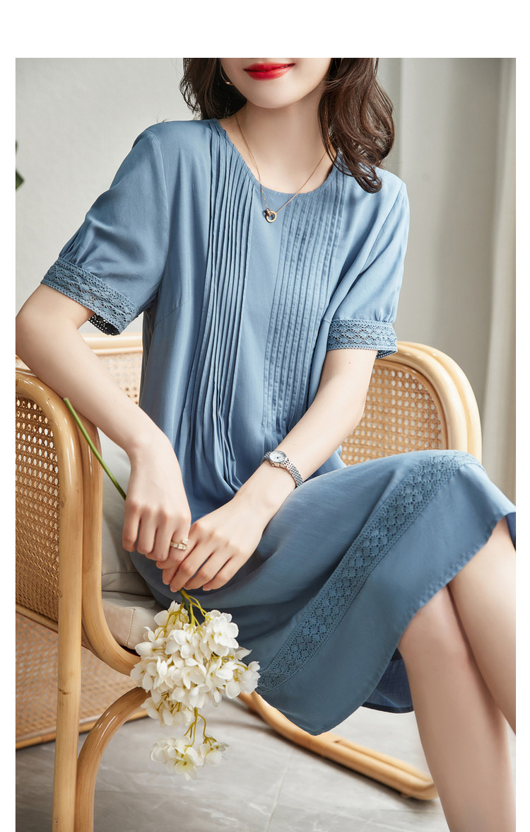 【文艺人棉娃娃裙】夏圆领短袖a字拼接织带连衣裙女中长款 776001