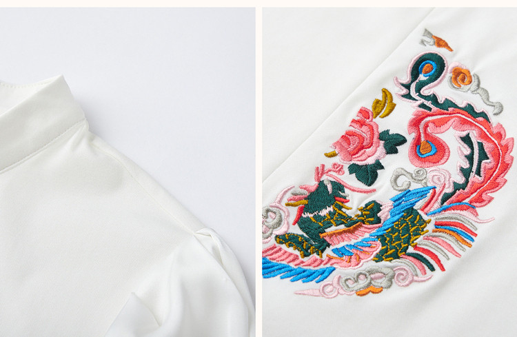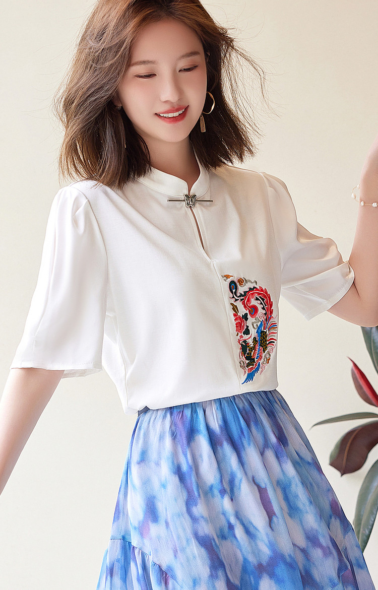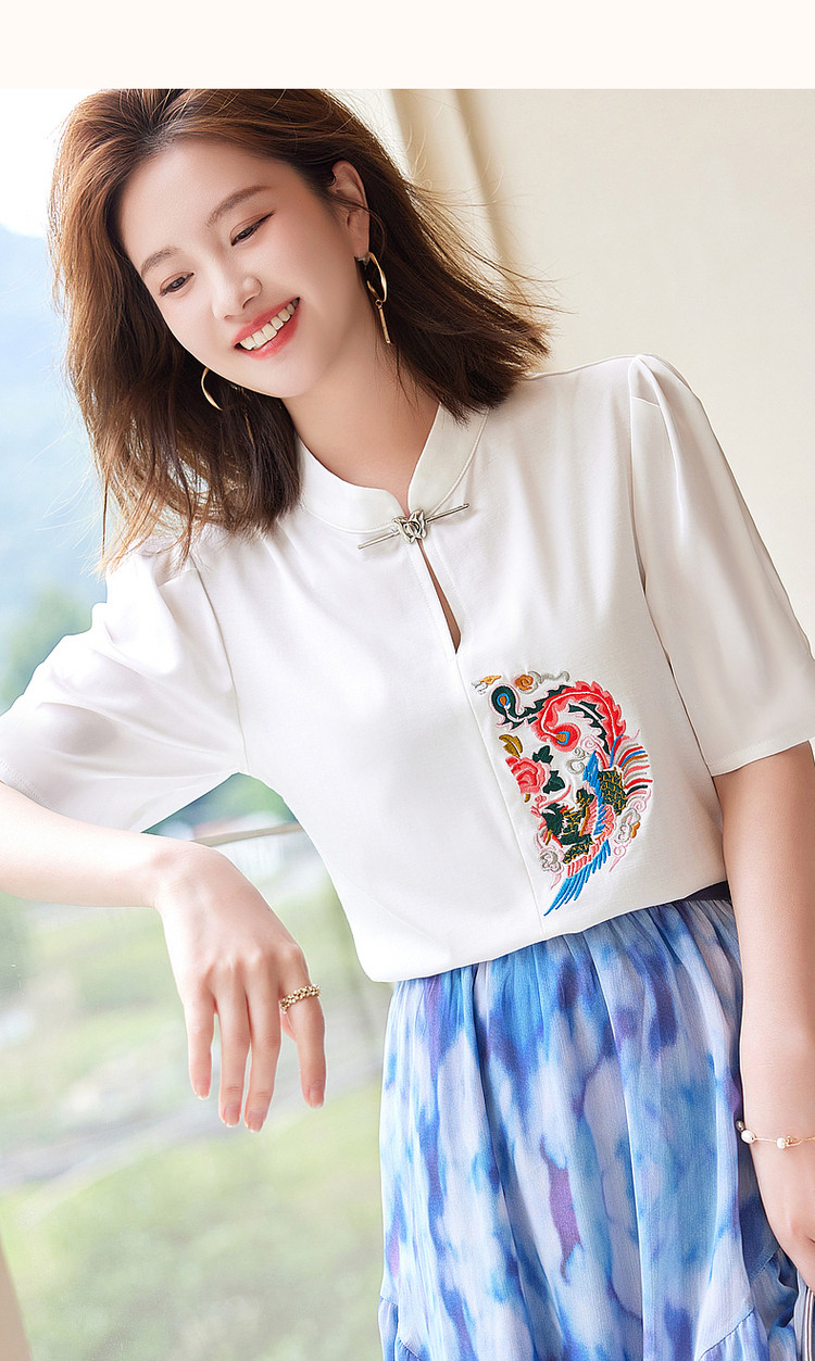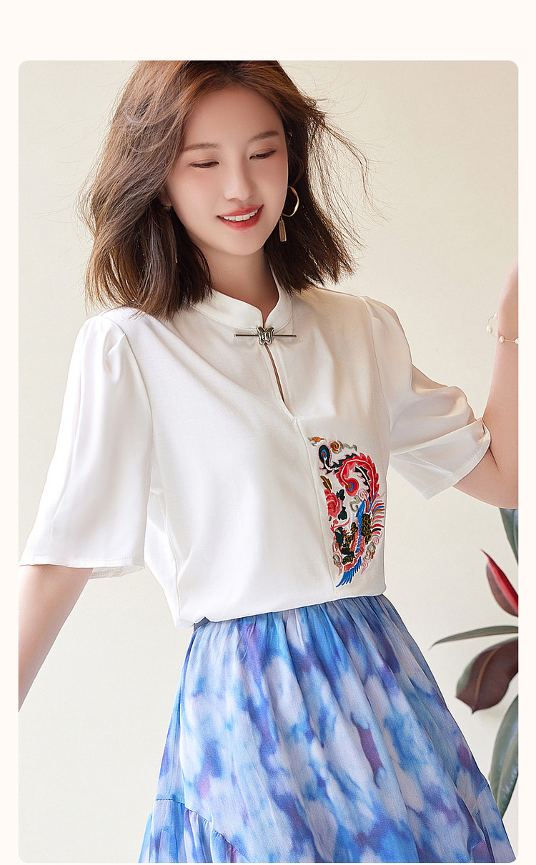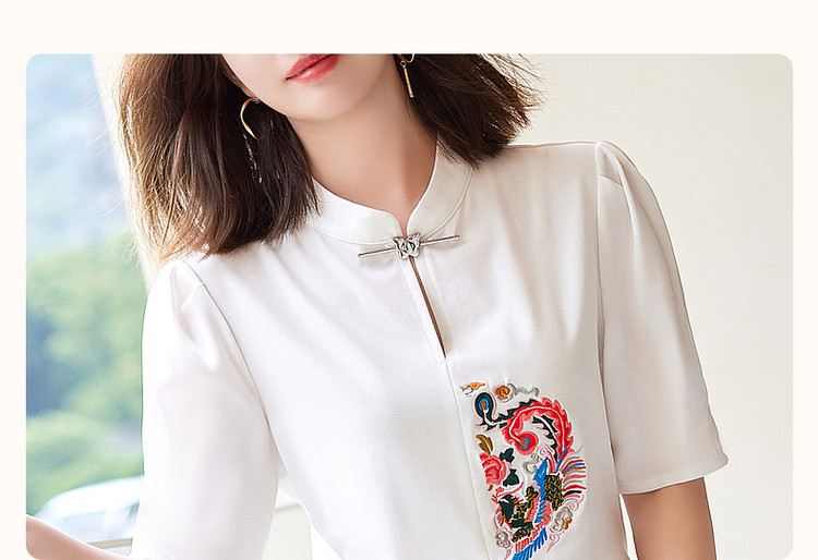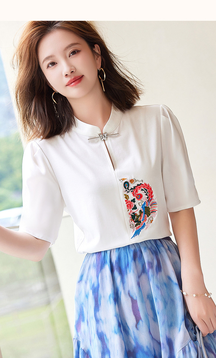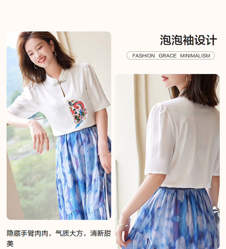 商品名称:【国风印花女式t恤】夏立领修身泡泡袖短袖t恤女 879553