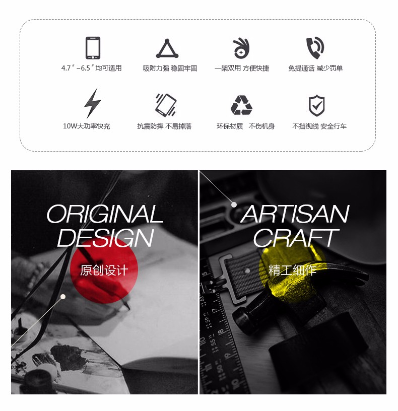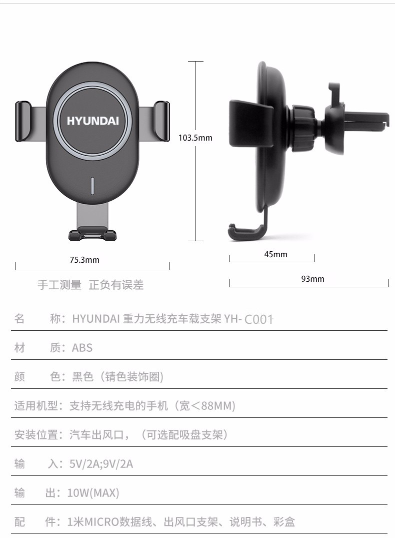 商品名称:HYUNDAI/现代重力无线充车载支架-黑色YH-C001
