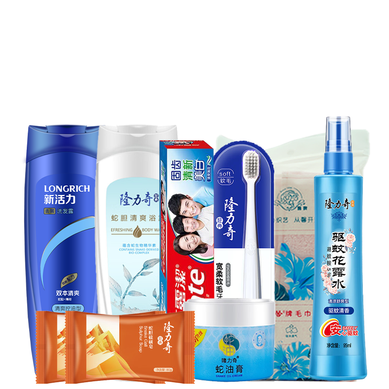 规格:隆力奇新活力去屑洗发露400ml+ 隆力奇蛇胆清爽沐浴露400ml+ 隆力奇驱蚊花露水198ml +隆力奇蛇胆硫磺皂80g*2+ 隆力奇瓶装蛇油膏60g+ 隆力奇宽柔软毛牙刷+ 高露洁超强牙膏90g+ 馨牌米兰印象纯棉毛巾34*76(颜色随机)