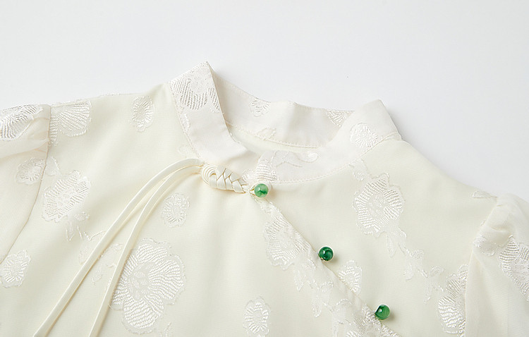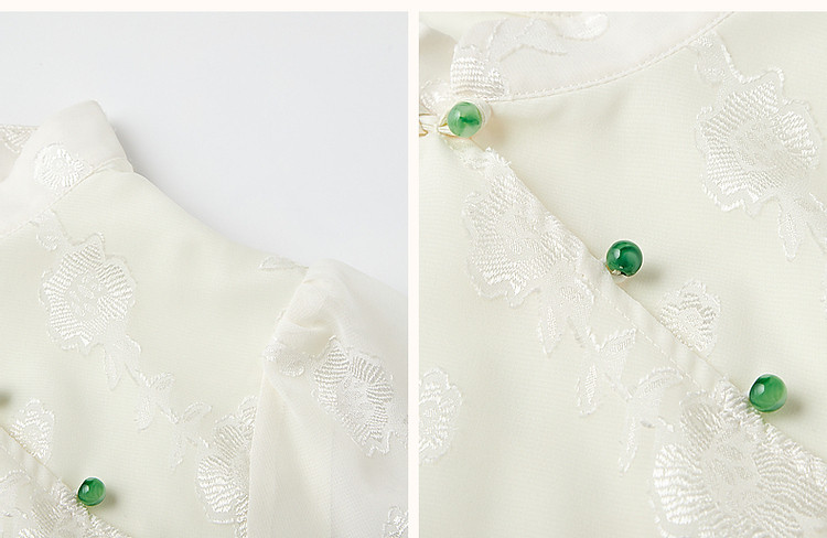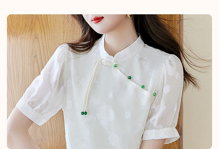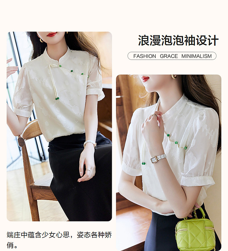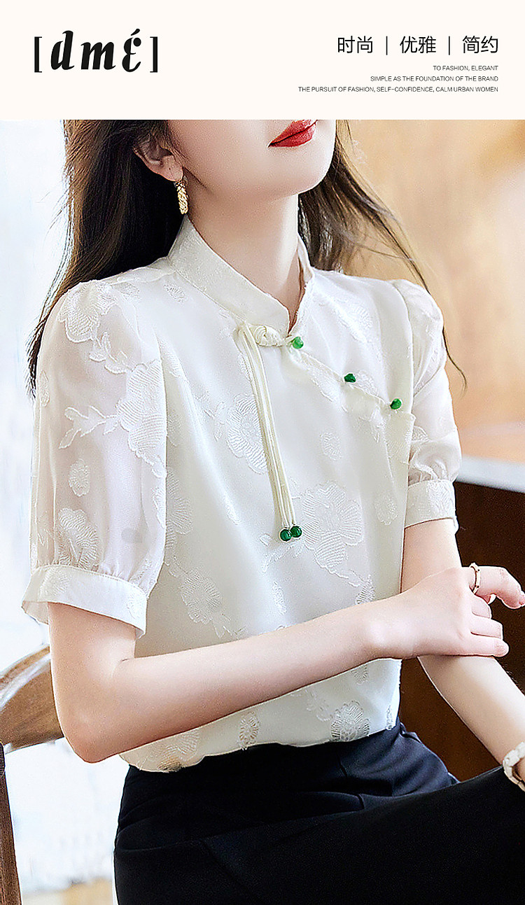 商品名称:【梦江南】夏国风新中式剪花雪纺衬衫斜襟立领盘扣绿珠衬衣女上衣 683009