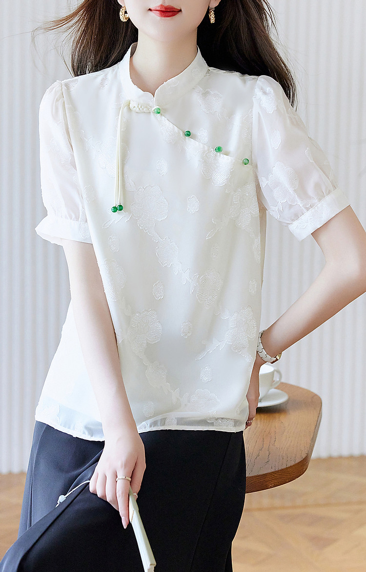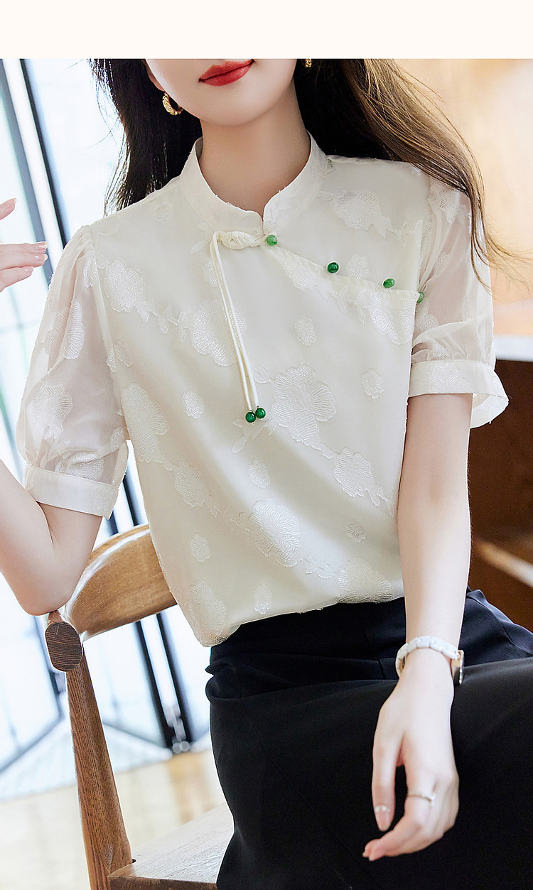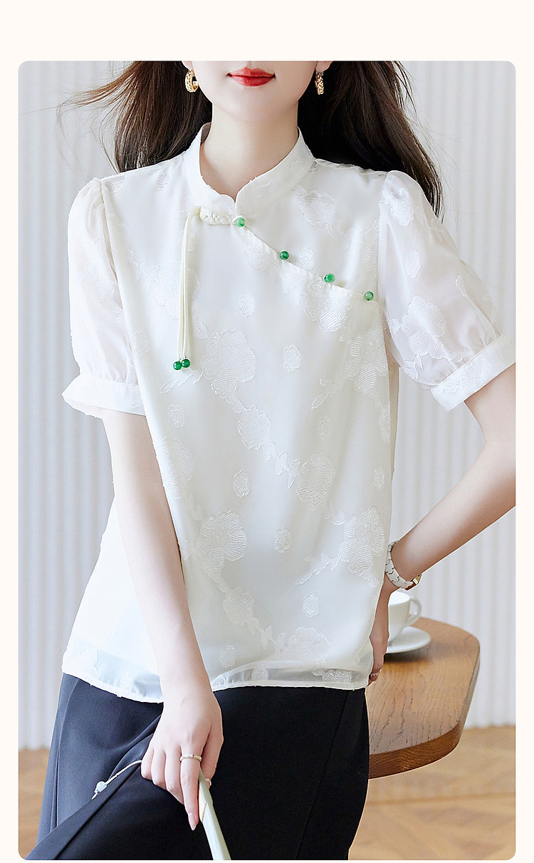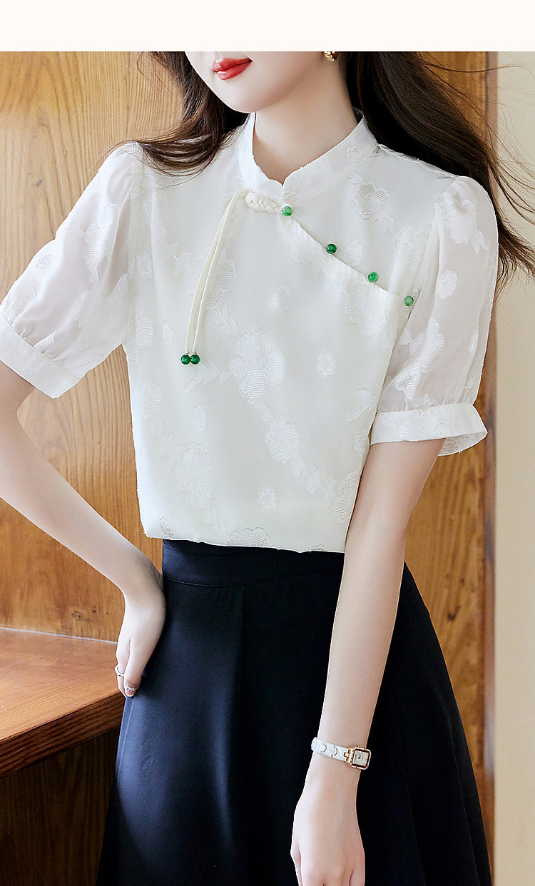 商品名称:【梦江南】夏国风新中式剪花雪纺衬衫斜襟立领盘扣绿珠衬衣女上衣 683009